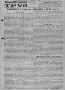 iCbUuefc/nuSHGUi райкома ВКП(б) и районного Совета депутатов трудящихся Новосибирской области Цена номера 15^коп. № 88 (1513) ВОСКРЕСЕНЬЕ, 4 ноября 1951 года. • V * ш « V-/ I 4 Д I V / 1 Ч У v y L'L-« I A V - # Об утверждении „Положения о выборах народных судов РСФСР" Президиум Верховно го Совета Российском Советской Ф е деративной Социалистической Республики постановляет: Утвердить «Положение о выборах народных судов РСФСР» . Председатель Президиу на Верховного Совета РСФСР М.ТАРАСОВ. Секретарь Президиума Верховного Совета РСФСР И. ЗИМИН. Москва, 29 октября 1951 года._______ ПОЛОЖЕНИЕ О ВЫБОРАХ НАРОДНЫХ СУДОВ РСФСР Г Л А В А 1 Избирательная система 1. Па основании статьи 113 Конституции РСФСР и статьи 22 Закона о судоустройство СССР, союзных н автономных республик народные суды избираются гражданами района на основе всеобщего, прямого и равного избирательного права при тайном голосовании сроком на три года. 2. Народным судьёй и народным заседателем может быть избран каждый гражданин РСФСР, пользующийся избирательным правом и достигший ко дню выборов 23 лот. Не могут быть избраны в народные судьи и народные заседатели лица, имеющие судимость. 3. На основании статьи 18 Конституции РСФСР граждане всех других союз - Г Л А В ннх республик пользуются на территории РСФСР нравом избирать и быть избранными в народные судьи и народные заседатели наравне с гражданами РСФСР 4. На основании статьи 23 Закона о судоустройство СССР, союзных и автономных республик народные судьи и народные заседатели избираются гражданами района по избирательным округам. Избирательный округ но выборам народного суда (народного судьи н народных заседателей) охватывает всё населенно, проживающее на территории деятельности данного народного суда. 5. Расходы, связанные с проведением выборов народных судов, производятся за счёт государства. А I I Списки избирателей 6. Списки избирателей для выборов народных судов составляются в городах исполнительными комитетами городских Советов депутатов трудящихся, а в городах с районным делением— исполнительными комитетами районных Советов, в посёлках—исполнительными комитетами поселковых Совотов, в сельских местностях—исполнительными комитетами сельских (станицы, деревни, хутора, аула) Советов депутатов трудящихся. 7. В списки избирателей включаются все граждане, мужчины и женщины, имеющие избирательное право и проживающие к моменту составления списков на территории данного Совета, достигшие ко дню выборов 18 лет, независимо от расовой и национальной принадлежности, вероисповедания, образовательного ценза, оседлости, социального происхождения, имущественного положения и прошлой деятельности. 8. Не вносятся в списки избирателей лица, лишённые избирательных прав но суду, в тсченно всего установленного в судебном приговоре срока лишения избирательных прав, а также лица, признанные в установленном законом порядке умалишёнными. 1). Списки избирателей составляются но каждому избирательному пункту по установленной форме в алфавитном порядке, с указанием фамилии, имени, отчества, возраста и местожительства избирателя н подписываются председателем и секретарём исполнительного комитета Совета депутатов трудящихся. 10. Списки избирателей, состоящих в воинских частях и войсковых соединениях, составляются за подписью командира. Все прочие военнослужащие вно