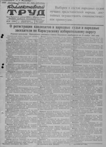 / и ^ М / ^ ^ ^ Ролет1Рии всех стран, соединяйтесь! 1СЬииеЛсти#нбш * ф Орган Карасунсного райнома ВКП(б) и районного Совета ___депутатов трудящихся, Новосибирсной области. №94 (1519) ВОСКРЕСЕНЬЕ, 25 НОЯБРЯ 1951 ГОДА Цена номера 15 копеек Выберем в состав народных судов лучших представителей народа, достойных осуществлять социалистическое правосудие. О регистрации кандидатов в народные судьи и народные заседатели по Карасукскому избирательному округу Решения исполкома Карасукского районного Совета депутатов трудящихся от 21 ноября 1951 года лнительный комитет К апаСУК РКЛ ГП п иН л и н п гп D__________ 0 1 Испо расукского район ого Сонета депутатов трудящихся решил: Зарегистрировать кандидатом в народные судьи но Карасукскому избирательному округу тов. Богатырёву Ию Михайловну— 24 лет, кандидата в члены ВКП(б), проживающую в рабочем посёлке Карасук, работающую нотариусом Карасукской нотариальной конторы, выставленную общими собраниями рабочих и служащих Карасукской машинно-тракторной станции, Карасукского пункта заготзерно и профсоюзной организацией железнодорожного узла станции Карасук. Зарегистрировать кандидатами в народные заседатели народного суда Карасукского района следующих товарищей: Амарцеву Евдокию Кирилловну— 44 лет, беспартийную, проживающую в селе Благодатное, работающую телятницей колхоза имени Тельмана, выставленную общим собранием колхозников сельхозартели имени Тельмана. Агеева Николая Георгиевича— 24 лет, члена НКП(б). проживающего в селе Чёрная Курья, работающего техником-раднетом Чёрно-Курышской МТС, выставленного общим собранием рабочих и служащих Чёр- но-Курышской МТС. Алдунгарова Кабулкаша Баймашевича— 29 лет. члена ВКП(б), проживающего в ауле Токнан, работающего бухгалтером колхоза имени Джамбула, выставленного первичной коммунистической организацией колхоза имени Джамбула. Борш, Анатолия Александровича— 2G лет, члена БКП(б), проживающего в рабочем посёлке Карасук, работающего начальником военно-учётного стола Карасукского поселкового Совета, выставленного первичной коммунистической организацией Карасукского поселкового Совета. Бахтину Клавдию Константиновну— 28 лет, члена БКП(б), проживающую в селе Чёрная Курья, работающую счетоводом колхоза «Новая семья», выставленную общим собранием колхозников колхоза «Новая семья». Богданова Карпа Захаровича— 55 лет, члена ВКП(б), проживающего в селе Благодатное, работающего директором Благодатского маслозавода, выставленного первичной коммунистической организацией колхоза имени Тельмана. Бурова Ивана Семёновича— 31 года, члена ВКП(б), проживающего в рабочем посёлке Карасук, работающего инспектором районного отдела культпросветра- боты, выставленного первичной коммунистической организацией культиросветучреждений. Бревнова Владимира Алексеевича— 37 лет, члена ВКП(б), проживающего в рабочем посёлке Карасук, работающего товарным кассиром ж. д. станции Карасук, выставленного первичной коммунистической организацией ж. д. станции Карасук. Володюшнину Елену Егоровну— 23 лет, беспартийную, проживающую в рабочем посёлке Карасуке, работающую районным организатором союзпечати, выставленную общим собранием рабочих и служащих Карасукской районной конторы связи. Воронова Ивана Фёдоровича— 27 дет, беспартийного, проживающего в деревне Берёзовка, колхозника, выста