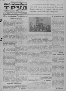 + т Пролетарии всех стран, соединяйтесь! 1бЫ1ие£ти£нбШ Ооган Нарасунсного р ай ком а ВНП (б ) и районного Совета __депутатов трудящихся, Новосибирсной области. № 91 СРЕДА ДЕКАБРЯ 1951 ГОДА Цена номера 15 копеек Под знаменем Сталинской Конституции Пятнадцать лет назад, 5 декабря 1930 года, Чрезвычайный VIII Всесоюзный съезд Советов утвердил новую Конституцию Советского Союза, которую наш народ назвал Сталинской но имени её творца. Сталинская Конституция- конституция победившего социализма. В ней зафиксированы исторические победы народов СССР, завоёванные ими подруководством большевистской партии, иод водительством великого вождя и учителя товарища Сталина. Сталинская Конституция гарантировала советским людям величайшие права, завоёванные в . героической борьбе,— право на труд, на отдых, на материальное обеспечение в старости, а также в случае болезни ипотери трудоспособности,право на образование, гарантировала равноправие граждан СССР, независимо от их национальности и расы. II нашей стране впервые в мире обеспечено подлинное равноправие женщин. Ни в одной капиталистической стране трудящиеся не имеют и но могут иметь таких прав. Пятнадцатьлет идётсоветский народ под знаменемСталинской Конституции. Нодэтим непобедимым знаменем трудящиеся СССР, руководимые партией Ленина—Сталина, одержаливсемирно-историческую победу в Великой Отечественной войне. Нод знаменем Сталинской Конституции советские люди достигли в послевоенные годы огромных успехов в осуществлении величественного сталинского плана коммунистического строительства. Они сооружают грандиозные гидроэлектростанции на Волге, Днепре, Дону и Аму-Дарье, строят гигантские каналы, создаютматериально-техническуюбазу коммуннз- ма. К этом году достигнуты новые замечательные победы. Как указывал в докладе «34-я годовщина Великой Октябрьской социалистической революции» товарищ J. И. Берия, итоги хозяйственного строительстваза 10 месяцев показывают, что план ^развития народного хозяйства в 1951 году будет выполнен и перевыполнен. Промышленность даст продукции на 15 процентов больше, чем в прошлом году, и вдвоепревысит продукциюпредвоенного 1940 года. Нынешний годознаменовался также новым подъёмом социалистического сельского хозяйства. Получен богатый урожайзерна, превышающий, как и в предыдущие несколько лет, семь миллиардов пудов. Вэтом году ещё более усиливается техническая база сельского хозяйства. Оно получит от государства 137 тысяч тракторов в переводе на пятнадцатнеиль- ные, 54тысячи зерноуборочных комбайнов, в томчисле 29 тысяч самоходных, а также два миллиона других сельскохозяйственных машин и орудий. Более двух третей всех нолевых работ в колхозах выполняется машинно-тракторными станциями. Значительно поднялось материальное благосостояние народа. Доходы рабочих и служащих, а также колхозников намного выросли по сравнению с довоенным уровнем. В этом году достигнуты новые успехи в развитии всех отраслей науки и культуры. Иное положение в странах капитала. Там сотни миллионов трудящихся влачат нищенское существование. Они несут на себе ярмо капиталистической эксплуатации. На их плечи падает вся тяжесть колоссальных расходов, связанных с гонкой вооружений и подготовкой новой мировой войны, которые осуществляются империалистическими правительствами. Сталинс