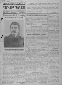 / Г / f ЦТ Л А Д У * / i n / L * ( A S b s r r * " ^ (Aa S i X J IJ Q W ?id ity H p o ie m i f u u есех стран, соединяйтесь.» 4СЬиа£&пи$н$ш Орган Иарасунсного райнома ВИП (б ) и районного Совета депутатов трудящихся, Иозосибирсной области. № 102 (1521) I 23 ВОСКРЕСЕНЬЕ, ДЕКАБРЯ 1951 ГОДА 1 Цена номера 15 кппррк 21 декабря И. В. Сталину исполнилось 72 года • _______ _________ _______ ______________ _ ИосифВисарионовичСталин «В Сталине миллионы рабочих всех стран видят своего учителя, на классических трудах которого они учились и учатся, как нужно успешно бороться против классового врага, как нужно готовить условия конечной победы пролетариата. Влияние Сталина— это влияние великой, славной большевистской партии, в которой ра- — бочио капиталистических стран видят образцовую партию рабочего класса, достойную подражания. Под руководством этой партии был не только низвергнут капитализм и установлена Советская власть— власть трудящихся, но и построен социализм в СССР. Рабочие всех стран знают, что каждое слово, произнесённое Сталиным,— это слово советского народа, что за каждым его словом следует дело. Трудящиеся массы всего мира на опыте победоносной социалистической революции, на опыте построения социализма в СССР п на опыте победы советского народа в Отечественной войне убедились в глубокой жизненной правде дела Ленина— Сталина. Ныне все свободолюбивые народы видят Сталине верного н стойкого ^З ащ и тн и ка мира, безопасности и демократических свобод. II. В. Сталин— гениальный вождь и учитель партии, великий стратег социалистической революции, руководитель Советского государства и полководец. Непримиримость к врагам социализма, глубочайшая принципиальность, сочетание в своей деятельности ясной революционной перспективы, ясности цели с исключительной твёрдостью и настойчивостью в достижении цели, мудрость и конкретность руководства, неразрывная связь с массами— таковы характерные черты сталинского стиля в работе. После Ленина ни одному вождю в мире не приходилось ещё руководить такими огромными, миллионными массами рабочих н крестьян, как II. В. Сталину. II. В. Сталин умеет как никто обобщать революционный, творческий опыт масс, подхватывать и развивать их инициативу, учиться у масс и учить массы, вести их вне- род к победе. Вся деятельность Сталина даёт нам образец сочетания огромной теоретической мощи с исключительным по своему объёму и размаху практическим опытом революционной борьбы». (Из книга „Иосиф Виссарион новин Сталин. Краткая биография") „Сталин—это Ленин сегодня. Наше счастье, что великий Сталин—вождь советского народа и трудящихся всего мира вдохновляет нас на творческий труд, руководит нами в борьбе за дальнейшее укрепление Союза Советских Социалистических Республик—оплота мира между народами, поборника демократии и социализма*'. Н. Шверник. Обязательства выполнены По нашему району С честью выполнили свои обязательства механизаторы О ктябрьской ААТС. К дню рождения И . 13. Сталина они обещали поставить на линей к у 5 тракторов . На се год няш ний день готовы к работе три гусеничны х и две колёсных машины. Н е жалел сил, работают ремонтники тт. Бабенко, М ос калёв, М и с тю к и другие . Они ежедневно выполняют задания на 100-150 процен тов. На производственном со вещании механизаторы МТС взяли новые обязательства. А. Шепелев. Слово сдержали К\знецы второй бригады сельхозартели им