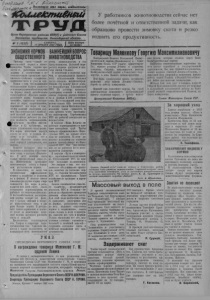 v f ' f / v }# •£ * ' & Пр0*втаРии всвх стран, соединяйтесь! - 44ЬиаеЛсти£н$ш Т Р У Д Орган Нарасунсного райнома ВНП(б) и районного Совета депутатов трудящихся, Новосибирской области. N‘- 3 (1532) | СУББОТА, 12 ЯНВАРЯ 1952 ГОДА 1 Цена номера 15 копеек У работников животноводства сейчас нет более почётной и ответственной задачи, как образцово провести зимовку скота и резко поднять его продуктивность. Г ' V ЭКОНОМИЯКОРМОВ- ОБЩЕСТВЕННОГО Зимовка скота— самый ответственный период в животноводстве. Чтобы хорошо провести сё, работники колхозов должны в соответствии с зоотехническими правилами организовать стойловое содержание, кормление скота и уход за ним. Помня о том, что правильное использование кормов является основным условием благополучия на фермах зимой, животноводы сельхозартели «Красное знамя» расходуют корма бережливо и экономно, тщательно подготов- .тяют их перед скармливанием, принимают все меры к тому, чтобы каждый килограмм кормов был использован с наибольшей пользой для животных. В сельхозартели работает на полную мощность кормозапарник, » борудована трашйея вмссти- остыо в 42 кубометра, на ферме установлена силосорезка. Все корма животным даются строго по весу и нормам. Поэтому и не случайно, что в колхозе «Красное знамя», весь скот хорошей упитанности, нет падежа. Неплохо налажено дело сохранения и развития общественного стада в колхозе «Пятилетка». У мест зимовки скота создан трёхмесячный запас сена. Животноводы проявляют повседневную заботу о бережном расходовании кормов. К сожалению, но везде так организовано шрользованис кормов в хозяйство и подвозка нх к фермам. В колхозо имени Амангельды грубые корма скармливаются без меры и веса, валятся под ногп скоту. Здесь установлен кормозапарник, но работает он непроизводительно. О бесхозяйственном расходовании кормов говорит тот факт, что с начала зимовки в колхозе израсходовано сена в два раза больше нормы. В результате такого кормления.н плохого ухода за животными допущен падёжь крупного рогатого скота н лошадей. , Председатель сельхозартели тов. Хаиров и секретарь парторганизации тов: Сарсенов мирятся с таким положением, не используют всех возможностей ВАЖНЕЙШИЙВОПРОС ЖИВОТНОВОДСТВА роста животноводства и его продуктивности. Большой перерасход кормов допущен в колхозе имени Сталина. В подготовке и подвозке кормов, в организации их правильного использования большое место отведено механизаторам. Однако эту задачу плохо решают механизаторы' Хорошпнской МТС. По договору машинно- тракторная станция в колхозе имени Андреева должна подвезти к фермам 4.500 центнеров сена. На сегодняшний день подвезено только 420 центнеров. В колхозе имени Калинина план подвозки также срывается. В этих артелях чисто простаивают силосорезки. Хорошпнская МТС их работой совершенно не интересуется. В колхозе «Маяк Ильича» не работает кормозапарник по причине негодности труб. Трубы взялась' отремонтировать Кара- сукская МТС, но дальше этого дело не двигается. В .этом же колхозе находится на подвозке кормов трактор дизель из Кара- сукской МТС. Rot уже месяц, как он не работает из-за неисправности радиатора. В колхозо «Путь к коммунизму ». простаивает трактор дизель из Студёновской МТС по причине выплавки подшипников. Это говорит о том, что техническое обслуживание тракторов, занятых на подвозке кормов, с