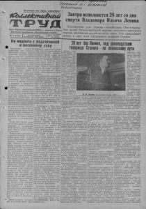 1 „Коллективный труд* 20 января 1952 года, № 5 (1534) НАКАНУНЕ ЛЕНИНСКИХДНЕЙ 1 рудящиеся нашей страны свя то чтут память основателя большевистской партии н Советского государства— В. II. Ленина. В эти дни повсеместно в городах и сёлах проводятся беседы лекции, доклады на тему: «28 лот без Ленина, под руковод ством товарища Сталина— по ленинскому пути». ...Но далеко от Москвы, в окружении рощ и лесов, вблизи высокого берега реки Пахры раскинулись Ленинские горки. Миллионам трудящихся всего мира известно это историческое место. Здесь 28 лет назад— умер Владимир Ильич Ленин. В Ленинские горки приезжают русские и украинцы, бслоруссы и уз беки, казахи и грузины, представители всех народов, населяющих Советский Союз, а так же делегации трудящихся зарубежных стран. Любовно охраняют места, связанные с жизнью и деятельностью В. И. Ленина, трудящиеся Казани. Многочисленные экскурсанты посещают университет, где учился Владимир Ильич, дом где он жил в соле Ленино (бывшее Кокушкнно),— место ссылки Ильича царским правительством. Свыше 1000 пропагандистов и агитаторов столицы Узбекской ССР— Ташкента выступают в районах с докладами и беседами: «28 лет без Ленина, иод руководством товарища Сталина— по ленинскому пути», «Ленин и Сталин— создатели Узбекской ССР». Ленин живёт в сердцах трудящихся всего мира. Живут и побеждают его бессмертные идеи. Овладев массами, ленинские идеи стали великой жизнеутверждающей силой, преобразующей мир. В. И. Ленин и И. В. Сталин. ПАМЯТИ ЛЕНИНА Агитаторы района накануне ленинских дней проводят беседы колхозах, совхозах, на предприятиях и учреждениях о жизни и деятельности В. И. Ленина. 14 января в парткабинете для докладчиков был прочитан инструктивный доклад на тему: «28 лет без Ленина, под руководством товарища Сталина—по ленинскому пути». Культпро- светучреждсння района подбирают литературу для докладчиков, агитаторов, оборудуют монтажи и витрины. В районной библиотеке оборудована витрина «Что читать к ленинским дням», монтаж «28 лет со дня смерти В. II. Ленина». В областной школе полеводов сделан монтаж «28 лет без Ленина—но ленинскому пути». В парткабинете райкома ВКП(б) оборудована витрина с литературой к ленинским дням, монтаж «Жизнь п деятельность В. И. Ленина». Н. Найгородцев. В ответ на почин членов артели „Победаи Следуя примеру членов ар- толп «Победа», Новосибирского района мы, колхоеннкп сельхозартели имени Андреева берём на себя следующие обязательства на 1952 год: Вырастим урожай зерновых культур по 13 центнеров с гектара на всей площади посевов, а на семенных участках получим 100-пудовый урожай. Обязуемся полуить 12 центнеров с гектара подсолнечника, 7 центнеров рыжика, 150 центнеров картофеля, 200 центнеров корнеплодов, овощебахче- пых— 100 центнеров с гектара. Обязуемся план агротехнических мероприятий выполнить в первой половине февраля. На площади 5.250 гектаров произведём снегозадержание. На паровые поля вывезем 2.000 тонн навоза, на семенные участки— 1.000 тонн перегноя. Кроме этого для семенных участков приготовим гранулированные удобрения. До начала сева все семена обогреем по методу академика Т. Д. Лысенко. Посев зерновых культур произведём до 15 мая рядовы- 'ми сеялками, а на семенных участках, на площади 767 гек- таров— перекростным способом. На площади 200 гектаров произведём посадку картофеля квадратно-гнездовым сп