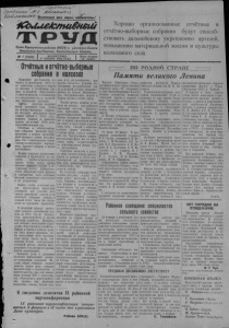 Пролетарии всех стран,' соединяйтесь! ХЬиае&ти&шй Т Р У Д Орган Нарасунсного райнома ВНП (б) и районного Совета депутатов трудящихся, Новосибирсной области. U N! 7 ВОСКРЕСЕНЬЕ, 27 ЯНВАРЯ 1952 ГОДА I Цена номера 15 копеек Хорошо организованные отчётные и отчётно-выборные собрания будут способ- % ствовать дальнейшему укреплению артелей, повышению материальной жизни и культуры колхозного села. Отчётныеиотчётно-выборные собраняи в колохзах Колхозное крестьянство добилось в прошедшем 1951 году серьёзных успехов в борьбе за высокие и устойчивые урожаи, за поднятие общественного животноводства и повышение его продуктивности,за дальнейшее укрепление колхозов. С|йчас колхозы подводят итоги истекшего года, чтобы на отчётно-выборных собраниях обсудить результаты труда членов артели в 1951 году, вскрыть ошибки и наметить задачи на новый 1952 сельскохозяйственный год. Отчётные и отчётно-выборные собрания колхозов будут проходить в период последних дней января и почти весь февраль. Это—ответственное хозяйственно-политическое мероприятие, большое событие в жизни колхозников. Нужно серьёзно подготовить собрания и провести их на высоком идейно-политическом уровне, чтобы члены артели активно ирнпяли участие в обсуждении отчёта. Добиваться, чтобы большевистская критика н самокритика была основным методомвыявления недостатков и их устранения. Важно, чтобы отчётный доклад председателя правления готовился при участии всех членов правления артели и до отчётного собрания доклад и годовой отчёт были бы обсуждены на заседании правления. В отчётном докладе необходимо осветить достижения колхоза за 1951 год по полеводству, животноводству и другим отраслям хозяйства. Показать, как добились колхозники укрепления общественного хозяйства. Цифры и факты в докладе должны быть яркий правдивы, чтобы колхозники ясно представляли плоды своего труда, соблюдение Устава сельскохозяйственной артолн, подъём материального икультурного уровня жизни колхозников. Большая роль в развитии колхозов принадлежит машинно-тракторным станциям. Поэтому общее собрание должно увидеть, какую роль сыграли механизаторы в полеводстве и животноводстве, как они выполняли договор 31ТС с колхозом, как соблюдались агротехнические правила при обработке колхозных земель. Нужно указать и то обстоятельство, как колхоз обеснечнл условия, необходимые механизаторам для их успешной работы: удовлетворялись ли нужды механизаторов, обслуживающих колхоз в период весенне-летних работ. Члены артели должны услышать из доклада, как работало правление колхоза, председатель, бригадиры, заведующие животноводческимн фермами. Каково положение колхоза сейчас в период проведения зимовки скота и подготовки к весеннему севу. Говоря о животноводстве, нужно отметить состояние скота, уход и содержание его, 'расходование кормов, механизация ферм, нет ли обезлички скота, осуществляется ли дополнительная оплата труда колхозникам. Серьёзное внимание в докладе надо уделить борьбе колхозников за урожай в 1952 году. Проводятся ли агромероприя- тпя, как ремонтируется сель- хозинвентарь, как подготавливаются семена. На отчётном собрании необходимо обсудить задачи, стоящие перед колхозом в 1952 году, [выявить неиспользованные резервы и возможности и использовать их для умножения общественного богатства колх