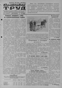 Пролетарии всех ст ран , еоедичлйт всь ! i£bUue£mu£H$U4 Т Р У Д Орган Нарасунсного райнома ВНП(б) и районного Совета Взять под неослабный, строжайший контроль работу агрозоотехнических курсов, добиться регулярного проведения занятий и на высоком теоретическом уровне, своевременно закончить изучение программного материала— задача руководителей курсов, председателей колхозов,сельсоветов, секретарей № 17 ( 1 5 4 6 ) ВОСКРЕСЕНЬЕ, 2 МАРТА 1952 ГОДА Цена н о м е р 15 к о п е е к парторганизации. Успешно завершить учёбу • ...............- V ....... ............- * ' 7 Механизаторы на агрозоотехнических курсах Социалистическое сельское хозяйство успешно решает задачи, поставленные партией и правительством. Успехи сельского хозяйства стали возможны благодаря передовой советской агрономической науке, на основе которой труженики колхозов и совхозов с каждым годом увеличивают урожайность нолей, развивают н улучшают общественное животноводство. Большое значение в деле подъёма урожайности н дальнейшего развития животноводства имеют трёхгоднчные агротехнические и зоотехнические курсы, призванные вооружать тружеников нолей знаниями сельскохозяйственной науки, сделать их мастерами полеводства и животноводства. Однако в нашем районе работа агрозоотехнических курсов попрожнему остаётся чрезвычайно низкой. II только лишь по той причине, что многие председатели колхозов, директоры МТС н совхозов, секретари партийных организаций перестали интересоваться работой курсов, не взяли учёбу под строгий контроль. Так, например, в колхозах имени Сталина, имени Будённого, «Новаясемья», «Пятилетка» занятия на курсах систематически срываются или совершенно не проводятся. Председатели этих колхозов и секретари партийных организаций самоустранились от руководства курсами, не придают нм должного значения. 11 января исполком райсовета рассматривал вопрос о положении дел с агротехнической учёбой в колхозе «Пятилетка» (председатель правления тов. Петренко). Тов. Петренко предложено было выправить положение дел с учёбой. По он не выполнил решение райисполкома, а отдел сельского хозяйства не проконтролировал выполнение своего решения, не потребовал зтого н от председателя колхоза н руководителя курсов. Неудовлетворительно поставлена агротехническая учёба колхозников в артели «Вперёд к коммунизму» (руководитель курсов агроном тов'. Борблнк). Председатель колхоза тов. Стремоухое н секретарь парторганизации тов. Обухов перестали интересоваться ходом занятий на курсах, нс предоставляют возможности колхозникам систематически посещать занятия. Назначение на работу колхозников ведётся без учёта работы курсов. Неудивительно поэтому, что из 10 слушателей, записанных в агротехнический кружок, посещают его систематически только 0 человек. Нс лучше дело обстоит н в колхозе имени Тельмана (председатель правления тов. Крупа). Контингент зачисленных на агротехнические курсы непостоянный, на зоотехнических курсах проведено только два занятия. Прекратили работу агротехнический н агрозоотехнический кружки в колхозе им. Джамбула. Там,где председатели артелей заботятся об учёбе колхозников, там, как правило, работа курсов поставлена хорошо. Взять к примеру колхоз «Красное знамя . Председатель правления артели тов. Полозок считает своей обязанностью организацию агрозоотехучёбы. О