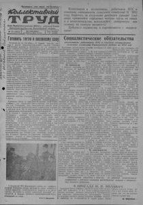 Пролетарии «сея стран, соединяйтесь! lCbua€Axnu€H$Ui Т Р У Д Орган Нарасунсного райкома ВНП(б) и районного Совета депутатов трудящихся, Новосибирсной области. N» 23 (1552) | ВОСКРЕСЕНЬЕ, 23 МАРТА 1952 ГОДА 1 Цена номера 15 копеек Колхозники и колхозницы, работники МТС и совхозов, специалисты сельского хозяйства! В 1952 году боритесь за получение высокого урожая! Ещё шире применяйте передовые методы труда на полях и в животноводстве, используйте доверенную вам технику на полную мощность! Добьёмся первенства в соревновании с андреев- цами! |if Готовить тяглоквесеннему севу Несмотря на то, что трак- 1 В первой бригаде тов. торы и другие сельскохо зяйственные машины в нашем социалистическом хо- ^ зяйстве сейчас производят ^ основные работы, роль рабочего тягла остаётся нй должной высоте. Задача каждого колхоза и совхоза не только бороться за сохранение поголовья лошадей, имеющихся в хозяйстве, но и прило- жить все усилия к тому, ^ чтобы досрочно выполнить государственный план раз- __ вития коневодства. Роль рабочих лошадей и другого рабочего тягла в предстоящую весеннюю кампанию будет очень велика. Поэтому надо добиться такого положения, чтобы эти животные к началу весенне-полевых работ были средней и вышесредней упи танности. Этого можно достигнуть л и т ь при условии правильного ухода и содержания рабочих лошадей и волов. Ц В колхозе <Путь к ком мунизму», где председателем тов. Пономарёв, ощ у щается большой недостаток в рабочем тягле. Но за ним не организован надлежащий уход, лошади и упряжь до нестоящего времени не закреплены за ездовыми; в бригаде № 1 рабочим волам нанесены травматические повреждения, из-за чего некоторые из них поставлены на длительное лечение. Ана логичное положение и в колхозе имени Сталина, где председателем тов. Пчелин- цев. В первой бригаде о т дельные лошади и волы доведены до истощения. Дьяченко колхоза «Новая семья» из 13 лошадей 5 нижесредней упитанности, в третьей бригаде тов. Шост из 12 лошадей 7 истощённых. • Все эти недостатки должны быть устранены в ближайшее время. Для этого необходимо слабый рабочий скот поставить на отдых и закрепить за конюхами. Конюха обязаны повседневно следить за тем, чтобы ездовые, за которыми закреплено тягло, перед запряжкой тщательно осматривали сбрую, во время, работы не переутомляли животных. На ферме должен строго соблюдаться распорядок дня. Только при таких условиях ухода, содержания и эксплоатации животных можно добиться желаемого результата. Н е обходимо, чтобы все лошади и рабочие волы чаще проверялись комиссиями с участием зооветспеииалис- тов. В случае, если "комиссия установит, что животное выведено из строя по халатности конюхов или ездовых, привлекать виновных к строгой ответственности. Все колхозы и совхозы на период весеннего сева должны иметь запас для каждой рабочей лошади не менее 5 центнеров сена, двух центнеров овса и кон центрированных кормов. У спех проведения весенне-полевых работ отчасти будет зависеть и от того, как правления колхозов и дирекции совхозов к этой кампании подготовят рабочий скот. Социалистические обязательства т ч ЩМШтШ i p Р | § 1 * Ж..;:*'- у-к г 'Щ ф г вини В Егоровской МТС Ьолотшшского района все отремонтированные тракторные моторы проходят на стонде холодную* п горячую прпработку, испытываются на мощность и на расход горючего. На снимке (в центре): заведу