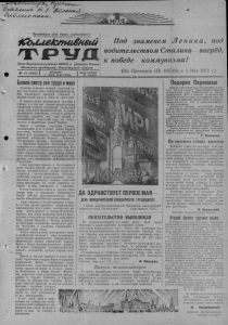 0(л^ 5х Лл а^€> /^ф ^ оЧг Пролетарии всех стран, соединяйтесь! tfbuue&rtui&isui Орган Нарасунсного райнома БНП(б) и районного Совета N! 34 (1563) ЧЕТВЕРГ, Цена номера 1 МАЯ 19.52 ГОДА 10 копеек Подзнаменем Ле нина , под водительством Сталина— вперёд, к победе коммунизма! (Из Призывов ЦК ВКП(б) к 1 Мая 1952 г.) Боевойсмотр силтруда имира Радостно встречает великий советский народ день Первого мая—международный праздник трудящихся, праздник единения и дружбы людей труда и мира во всём мире. В первых рядах праздничного шествия в городах и сёлах мы увидим прославленных строителей великих сооружений сталинской эпохи, новаторов промышленности и социалистического земледелия, учёных и деятелей культуры, отдающих все свои знания и вдохновенный творческий труд на благо, счастье и процветание нашей Родины. Вместе с великим Советским Союзом, указывающим путь к новой жизни народам всех стран, свободно и радостно празднуют Первое мая трудящиеся европейских стран народной демократии— Польши, Румынии, Чехословакии, Венгрии, Болгарин, Албании — и Китайской Народной Республики, освободившиеся от империалистического ига. Под знаком усиления борьбы за единое, независимое, демократическое, миролюбивое германское государство пройдут первомайские торжества в Германской Демократической Республике. Слова братского привета и благодарности шлют сегодня народы этих стран советскому народу, который высоко держит знамя пролетарского интернационализма. Оказывая свободным народам разностороннюю экономическую и культурную помощь, советский народ вдохновляет их своим примером на борьбу за мир, демократию и социализм. Успехи Советского Союза и других стран лагеря мира и демократии активизируют борьбу рабочих капиталистических стран против империалистических правительств. Алые знамёна и боевые призывы к борьбе за мир, против кровавого американского империализма будут реять сегодня над рядами демонстрантов в капиталистических странах. Нод этими знамёнами пройдут французские и бельгийские шахтёры, металлисты Рура, докеры Франции и Италии, решительно требующие повышения жизненного уровня населения и удаления американцев с территорий своих стран. Новую могучую волну всенародного гнева и возмущения вызвали в миро чудовищные преступления американских империалистов, применивших против героических народов Кореи и Китая бактериологическое оружие, «К ответу зачинщиков бактериологической войны!»— настойчиво требуют народы всего мира. Крепче в этп дни сжимают в руках винтовку героические солдаты Кореи п народные добровольцы Китая, отражающие атаки американских агрсссоров-иоработителей. Отважно сражаются борцы за свободу народа на Филиппинах, в Бирме. Малайе, Индонезии, нарастают силы сопротивления империализму в странах Ближнего н Среднего Востока, на африканском материке. Волнующие известия приходят к нам из далёкого Вьетнаме, население которого одерживает победу за победой в борьбе за своё освобождение от ига империализма. II нет такой силы в мире, которая бы сломила дух интернациональной солидарности трудящихся всех стран, их волю к борьбе за мир, за свободу и демократию. ДА ЗДРАВСТВУЕТ ПЕРВОЕ МАЯ— ДЕНЬ МЕЖДУНАРОДНОЙ СОЛИДАРНОСТИ ТРУДЯЩИХСЯ! Плакат работы художника В. Викторова, выпускаемый издательством „Искусство*1. Прессклише ТАСС . ОБЯЗАТЕЛЬСТВО ВЫП