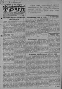 Qv&fi J^ C U jO ЛС/ № & fQ 6 4 e fit4 *£ ^ \ А л )у М ^ ® Ш ° (Х*Ь$)аи всех стран, соединяйтесь! 1Соиаекхгш£н£Ш Т Р У Д Орган Нарасунсного райнома ВИП(6) и районного Совета депутатов трудящихся, Новосибирсной области. N* 51 (1580) ВОСКРЕСЕНЬЕ, 29 ИЮНЯ 1952 ГОДА I Цена номера Ю копеек Сейчас самый ответственный период в животноводстве. Заготовку кормов успешно завершат там, где партийно-политическая и культурно-массовая работа будут стоять о на должной высоте. ВЫШЕУРОВЕНЬ МАССОВО-ПОЛИТИЧЕСКОЙ РАБОТЫ НА СЕЛЕ Труженики нашего района напрягают все усилия для того, чтобы повысить урожайность всех сельскохозяйственных культур, увеличить поголовье скота и повысить его продуктивность. Эти почётные задачи будут выполнятся лучшо, если партийные, комсомольские организации и культпросвотучрежде- ния поднимут на более высокий уровень политическую и культурно-массовую работу в деревне. Хорошо налажена массово -политическая работа в Хоро- ^шинской МТС. Руководитель агитколлектива тов. Руцкпй конкретно руководит агитаю рами строго выполняет планы работы. В результате всего этого агитаторы повседневно работают сроди населения. Так, например, комсомолка Кравченко Нина является агитатором в тракторной бригаде №11. Она систематически проводит беседы и читки газет среди механизаторов, рассказывая нм в часы досуга о знаменательных событиях ,в нашей стране, о том, что делается за рубежом. Тов. Кравченко активно участвует в выпуске стенной газеты и «боевого листка». Только за период весеннего сева в бригаде выпущено 6 стенных газот и 11 «боевых листков». Она ежедневно подводит итоги работы механизаторов и заносит их на доску показателей. Агитационная работа сыграла большую роль в работе механизаторов. Тракторная бригада успешно завершила весенний сев и была занесена на районную Доску почёта. Активно работает агитколлектив совхоза «Октябрь» (руководитель тов. Подорожный). Здесь агитаторы проводят повседневную работу с тружениками совхоза .Так, коммунист агитатор тов. Сапрыкин ежедневно проводит беседы и читки с доярками фермы №2. Он все своп беседы увязывает с задачами, стоящими перед совхозом. центнеЗаготавливают сено и силос По родной стране Большую работу проводят агитаторы колхоза «Красное знамя». В бригаде по кормодобыванию (бригадир тов. Гаврилов) агитатором работает тов. Чумак, который не только проводит беседы и читки газет, но и выявляет недостатки в работе бригады и всячески старается их устранить. По вечерам тов. Чумак организует коллективное слушание радио. Не удивительно поэтому, что колхоз «Красное знамя» идёт первым в районе по заготовке кормов. Здесь уже скошено более 500 гектаров трав п заскирдовано более 2000 ров сена. Но в некоторых колхозах агитаторы работают кампанейски, безсистемно, ими никто не руководит. В колхозе имени Будённого (секретарь парторганизации тов. Скворец) за весь период весеннего сева не проведено ни одного семинара агитаторов. Здесь многие агитаторы прекратили свою работу. Такое же положение в колхозах имени Куйбышева, имени Сталина и других. Большое значение в деле воспитания трудящихся играют лекции и доклады. За 4,5 месяца этого года населению прочитано 983 лекции и доклада. Но мало читалось докладов и лекций на естественно-научные и сельскохозяйственные темы. Сельская интеллигенция принимает слабое участие в лекционной пропа