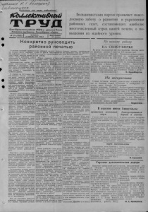 т п г ^ д£ / & у#£*сг/а^ биЛ^СС/#'*'*?^*- Пролетарии всех стран, соединяйтесь! iCbuueJcmuSHGUi nrf>i/n Орган Нарасунекого райкома ВНП(б) и районного Совета депутатов трудящихся, Новосибирской области. N-' 54 (1583) | ЧЕТВЕРГ. 10 ИЮЛЯ 1952 ГОДА Иена номера 10 копеек Большевистская партия проявляет повседневную заботу о развитии и укреплении районных газет, составляющих наиболее многочисленный отряд нашей печати, о повышении их идейного уровня. ► Ко н к р е т н о руководить районной печатью В системе печатной пропаганды большое место 'Занимают у пас районные газеты. В Советском Союзе имеется свыше четырёх тысяч районных газет, издающихся на языках всех народов нашей Родины. Большевистская партия проявляет повседневную заботу о развили и укреплении районных газет, составляющих наиболее многочисленный отряд нашей печати, о повышении их идейного уровня. В докладе на XVI съезде партии товарищ Сталин указывал, что центр тяжести колхозного строительства перемещён в районные организации. „Сюда с т е к аю т с я нити колхозного с т р о и т е л ь с т в а и всякой другой хозяйственной р а б о ты в деревне, и по линии кооперации, и по линии Советов, и по линии кр еди та , и по линии за го то во к" . Важную роль в идейно-политической и хозяйственной жизни районов призвана сыграть районная печать. Основная задача районных газет состоит в том, чюбы на основе пропаганды политики и мероприятий партии и правительства, опираясь на конкретные, близкие и понятные факты из местной жизни, идейно-политически воспитывать население, организовывать кодхоз- никонана решение стоящих перед районом задач. За последнее время местные партийные организации, руководствуясь указаниями Центрального Комитета ВКП(б), стали уделять больше внимания районной печати, конкретнее руководить её деятельностью. Вопросы работы районной печати выносятся на обсуждение пленумов партийных комитетов. Бо многих областях РСФСР, Украины, Белоруссии проведены совещания редакторов районных газет с обсуждением очередных задач районной печати. Райкомы и обкомы партии стали чаще заслушивать на своих заседаниях отчёты редакторов районных газет и доклады о руководстве газетами. обсуждать меры по повышению уровня районной печати. Партийные органы ведут значительную работу по укреплению редакций районных газет способными, любящими своё дело кадрами, организуют переподготовку газетных работников через различные курсы; во многих областях организована практика работников районных га-ет при редакциях областных газет. Состоявшийся недавно пленум Ростовского обкома ВКП(б) специально обсудил вопрос о мерах по улучшению работы райовных и городских газет. На пленуме отмечалось, что некоторые районные комитеты партии за по следнее время стали уделять больше внимания своим печатным органам, в результате чего работа газет значительно улучшилась. Вместе с тем участники пленума указывали, что ещё многие райкомы плохо руководят своими газетами, секретари райкомов мало интересуются их содержанием, не валравляют повседневно их деятельность. Там, где партийные комитеты конкпетно пуководят работой газет,—налицо серьёзное улучшение районной печати, повышение её роли в общественно-политической и хозяйственной жизни района. Можно привести в качестве примера газету „Прапор перемоги* Ахтырского района, Сумской области. Газет