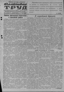 v „Коллективный тр уд * ш августа В райкоме ВИП (б) и райисполкоме Об условиях социалистического соревнования в районе на период уборки урожая и хлебозаготовок в 1952 году 1 П Л _ _ _ _ _ _ _ _ _ _ _ _ _ _ _„ \ Г , . П А Л . . Т > Г » 1 ' О Ч - Т А М 1 / Л Я За проведение хлебоуборки и хлебозаготовок в сжатые сроки при высоком качестве считать победителями в социалистическом соревновании: а) сельский Совет, колхозы которого косовицу хлебов закончат в 25 рабочих дней при хорошем качесг ве и обеспечат выполнение плана сдачи хлеба государству до 10 сентября с. г.; б) колхоз или совхоз, выполнивший план уборки урожая с высоким качеством работ в 25 рабочих дней и обеспечивший выполнение плана хлебозаготовок не позднее 10 сентября; в) машинно-тракторную станцию, закончившую уборку, обмолот хлебов и сдачу натуроплаты в обслуживаемых колхозах не позднее 20 сентября. Для основных профессий на уборке и сдаче хлеба государству установить следующие условия социалистического соревнования и считать победителями: а) комбайнера, убравшего за 25 рабочих дней с высоким качеством на самоходном комбайне не менее 350 гектаров, намолотившего за это же время не менее 6000 пудов хлеба, а ежедневно необходимо убирать не менее 14 гектаров, намолачивать не менее 250 пудов хлеба; на комбайне „Сталинец* за сезон убрать 6(0 га, намолотить не менее 10.800 пудов зерна, ежедневно убирать по 20 гектаров и намолачивать не менее 360 пудов зерна; б) тракториста и бригадира тракторной бригады, обеспечивших бесперебойную работу тракторов на уборке урожая; в) машиниста, убравшего на лобогрейке за период хлебоуборки не менее 120 гектаров с хо рошим качеством работы; г) колхозников, работников МТС и совхозов, работающих на очистке зерна, добившихся выработки за свои смены'на ПИМ-1 150 центнеров, на сортировках и веялках—100 центнеров, на ОС-1 —80 центнеров, при условии выполнения пятидневных заданий; д) шофёра, работающего на вывозке хлеба, ежедневно делающего на трехтонной автомашине .460 тонно-километров, на полуторатонной—210 тонно-километров; е) транспортную бригаду, выполнившую установленное задание но вывозке хлеба на живом тягле на заготовительные пункты не позднее 10 сентября. Учреждено 5 переходящих красных знамён исполкома райсовета и райкома ВК11(6) для вручения победителям, выполнившим условия социалистического соревнования—сельскому Совету, колхозу, МТС, совхозу и комбайновому агрегату. Присуждение переходящих красных знамен будет производиться три раза в месяц. Учреждены Доски почёта в райнн й газете и в райцентре, на которые будут заноситься передовики уборки урожая и хлебозаготовок^ Райисполком ’ и райком ВКП(б) обязали секретарей партийных организаций колхозов, совхозов и МТС, председателей колхозов, директоров МТС и совхозов учредить в колхозах, совхозах и МТС переходящие красные знамёна для вручения, бригадам, фермам, комбайновым агрегатам ва уборке урожая. Учредить в каждом колхозе, МГС и совхозе Доски почёта для занесения передовиков хлебоу-’ борки. Предложено председателям колхозов, директорам МТС и совхозов, секретарям партийных организаций колхозов, совхозов и МТС широко развернуть социалистическое соревнование среди колхозников, работников МТС и совхозов за досрочное выполнение и перевыполнение планов хлебоуборочных работ и хлебопоставок, за выполнение и перевыполнение сменных и дне