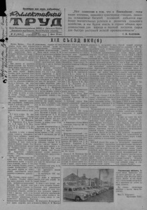 1 Пролетарии всех стран, соединяйтесь! Орган Нарасунсного райкома ВНП(б) и районного Совета депутатов трудящихся, Новосибирсной области. N! 81 (1610) 9 0КТЯБРЯЕ11952 года JУ ена Ю «оп. „Нет сомнения в том, что в ближайшие годы наши колхозы, машинно-тракторные станции, совхозы, оснащенные богатой техникой, добьются еще более значительных успехов в развитии сельского хозяйства, и мы будем иметь в стране обилие продовольствия для народа и полный достаток сырья для быстро растущей легкой промышленности”. Г. М. МАЛЕНКОВ. \ v; Москва, Кремль... Сюда обращены взоры всех народов Советского Союза, всех трудящихся мира, всего прогрессивного человечества. Здесь в Большом Кремлёвском дворце 5 октября начал свою работу XIX съезд Всесоюзно!! Коммунистической партии (большевиков). Еще задолго до открытия съезда Большой зал Кремлей ского дворца заполнили делега ты. На съезд собрались лучшие люди партии Ленпна- Сталипа. Среди делегатов съезда—видные партийные и государственные деятели, известные всей стране работники промышленности, сельского хозяйства, науки и культуры, чей творческий труд являет пример беззаветного служения народу, великому делу коммунизма. В числе делегатов— прославленные в боях за честь и свободу нашей Родины военачальники, герои Отечественной войны. На съезд прибыли делегации зарубежных коммунистических и рабочих партий. До начала съезда осталось несколько минут. В зале ео- царяется торжественная тишина. В 7 часов вечера. На трц- буцо появляются товарищ И. В. Сталин, товарищи В. М. Молотов, Г. М. Маленков, К. Е. Ворошилов, Н. А. Булганин, Л. II. Берия, Л. М. Каганович, II. С. Хрущев, А.А. Андреев, А. И. Микоян, А. Н. Косыгин. Делегаты п гости в едином порыве встают'и восторженно приветствуют любимого вождя партии и советского народа великого Сталина и его верных соратников. В зале долго не смолкают бурные овации. Раздаются приветственные возгласы: «Товарищу Сталину— ура!», «Великому Сталину — ура!», «Да здравствует товарищ Сталин!», «Родному, любимому Сталину— ура!». Это были незабываемые минуты. Это была волнующая демонстрация любви и преданности великому вождю и учителю товарищу Сталину, демонстрация несокрушимого единства нашей партии, её монолитной сплочённости вокруг ленинско-сталинского руководства. Имя Сталпна—сердце каждого человека. Сталину обязан наш народ величием своей Родины, всемирно-историческими победами. Под мудрым водительством великого Сталина советский народ построил социалистическое общество, отстоял в боях с врагами честь п независимость своей отчизны, спас мировую цивилизацию от фашистского варварства. Под водительством товарища Сталпна наш народ уверенно идёт к X I X СЪЕЗД В К П ( б ) коммунизму, отдавая все своп силы и могучий талант по осуществлению гениальных сталинских предначертаний. Когда стихли овации, В. М. Молотов произносит вступительную речь от имени Центрального Комитета ВКП(б). Он тепло приветствует делегатов и гостей— представителей коммунистических и других братских партий рабочего класса. В. М. Молотов предлагает почтить вставанием славную память тех, кто в годы войны против германских и других агрессоров героически защищал нашу Советскую Родину и отдал свою жизнь за наше правое дело. Он предлагает почтить память виднейших деятелей партии и Советского государства — А. С. Щербакова, М. И. Калинина, 