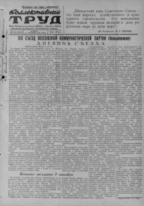 Пролетарии всех стран, соединяйтесь! &Ьиае4стивнМ1 Т Р У Д Орган Нарасунсного райнома ВНП(б) и районного Совета депутатов трудящихся , Новосибирсной области. № 83 (1612) I 16 0КТЯБРЯГ1952 ГОДА I Уена W ноп- „Пятилетний план Советского Союза— это план мирного хозяйственного и культурного строительства. Его выполнение будет новым крупным вкладом в дело укрепления мира во всём мире“. ( Из донлада moe. М. 3 . САБУРОВА) XXI СЪЕЗД ВСЕСОЮЗНОЙ КОММУНИСТИЧЕСКОЙ ПАИРТИ(большевиков) Д Н Е В Н И К С Ъ Е З Д А На примере Магнитогорского металлургического комбината имени Сталина оратор иллюстрирует большой культурно- технический рост кадров промышленности. Тов. Аристов предлагает предусмотреть более быстрое строительство и освоение рудников, указывает на отставание проектирования промышленных предприятий, на необходимость расширения связи научен с производством и увеличения количества научных учреждений в области. Затем т. Аристов останавливается на вопросах развития сельского хозяйства в условиях Урала и Сибири. Он считает необходимым изучить вопрос о проведении посевов в ранние сроки и обобщить накопленный в этом отношении опыт. Министр нефтяной промышленности СССР т. Байбаков посвятил свое выступление вопросам развития нефтяной промышленности в новой пятилетке. В результате огромной повседневной помощи, оказываемой партией н Советским правительством, нефтяники досрочно вы по л нили четвёртый пятн- лотнпй план по добыче п переработке нефти. Исключительно большие н почетные задачи ставятся перед нефтяниками в проекте директив съезда. Добычу нефти предусматривается поднять на 85 процентов. Тов. Байбаков считает целесообразным отразить в директивах съезда необходимость дальнейшего роста добычи нефти в восточных районах страны, резкого увеличения объёма буровых работ, широкого внедрения новых методов разработки нефтяных залежей. В конце утреннего заседания с приветствиями съезду выступили представители ряда зарубежных коммунистических партий. Председательствующий предоставляет слово генеральному секретарю ЦК Компартии Китая тов. Л ю Шао-цп. Делегаты и гости тепло встречают представителя братской компартии и великого китайского народа. Передав делегатам съезда братский привет от коммунистов Китая и от всего великого ие. Начало в № 82). китайского народа, Лю Шао-цп под бурные аплодисменты оглашает поздравление ЦК Коммунистической партии Китая товарищу Сталину и делегатам съезда, подписанное председателем Мао Цзе-дуном. В iipuBCTCTBiiu говорится о вдохновляющей и организующей роли Всесоюзной Коммунистической партии, выпестованной Лениным иСталиным, о её грандиозном вкладе в коммунистическое движение. Имена Ленина н Сталина—знамя, ведущеевперёд трудящихся всего земного шара. Коммунистическая партия Советского Союза—пример для всех коммунистических и рабочих партий. СССР—могучий оплот мира и демократии во всём миро. Тов. Лю Шао-ци произносит здравицу в честь Коммунистической партии Советского Союза, в честь побед марксизма-ленинизма, в честь великого вождя п учителя трудящихся всегомиратоварища Сталина, в честь могучей дружбы н союза народов Китая и СССР. Бурными, долго не смолкающими аплодисментами встречают делегаты съезда эти слова. Съезд тепло встречает председателя Коммунистическойпартии Чехословакии тов. Кл е- мента Готв