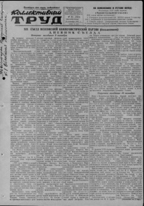 „Коллективный труд* XIX СЪЕЗД ВСЕСОЮЗНОЙ КОММУНИСТИЧЕСКОЙ ПАРТИИ (большевиков) (Продолжение) Онзаявляет, чтокоммунистыБе- лоруссин единодушно одобряют проект измененного Устава, и сообщает о ряде дополнении п замечаний по проекту, высказанных при его обсуждении в парторганизациях. Делегаты встречают тов. А.Н. Поскребышева аплодисментами. В своей речи он говорит об историческом значении XIX съезда партии, определившего главную задачу для данного периода—построения коммунизма. Строительство коммунизма есть творчество миллионов. Это—неиссякаемая инициатива и новаторство трудящихся, это высокая организованность п дисциплинированность людей, поистине всеобщий трудовой героизм, необычайно возросшая высокая культура трудящихся города и ' деревни. Коммунизм тем скорее может наступить, чем лучше и организованнее будут трудиться все советские граждане, способные к труду. Тов. Поскребышев подробно останавливается на вопросах, связанных сукреплением государственной и партийной дисциплины, правильного подбора, расстановки и восспптания кадров, всемерного развития критики и самокритики. Д Н Е В Н И К С Ъ Е З Д А Бурными аплодисментами встречают делегаты генерального секретаря Коммунпстпческой партпи Испании тов. До- л о ре с Иб а рру ри , которая передает съезду горячий прпзет от испанских коммунистов и испанских народных масс. Её яркая речь была выслушана с большим вниманием н неоднократно прерывалась бурными аплодисментами. От Народно-социалистической (коммунистической) партии Кубы съезд приветствовал генеральный секретарь партпп тов. Бл ас Рока , встреченный продолжительными аплодисментами. Члены делегации Коммунп-.ратическую, миролюбивую ГерВечернее заседание 10 октября На вечернем заседании съез- от масс, нечуткое отношение к да продолжалось обсуждение нуждам и запросам трудящпхбюрократпзм, доклада тов. Н. С. Хрущёва об изменениях в Уставе ВКП(б). Делегаты в своих выступлениях горячо одобряют проект изменённого Устава партпи. Они подчеркивают, что проект Устава направлен на дальнейшее укрепление силы и могущества нашей партии. Председательствующий т. К у у с и пе н предоставляет слово тов. Борис ову (Якутская АССР). Проект изменённого Устава партии, говорит он, отражает накопленный за последние годыопыт деятельности нашей партпп. Одобряя проект Устава, оратор предлагает некоторые дополнения. Он считает целесообразным дополнить третий параграф проектаУстава указанием на то, что коммунист должен строго соблюдать нормы коммунистической морали. На конкретных примерах пз практики ленинградской партийной организации тов. Коз л ов (Ленинград) показывает, насколько назрела необходимость внести измененияв Устав партпи, более полно определить обязанности членовпартии. Он подробно останавливается на недостатках вподборе и расстановке кадров, в работе по воспитанию коммунистов в духе, строгого соблюдения партийной п государственной дисциплины. О росте активности партийных масс, вызванной обсуждением предсъездовских документов, говорит в своём выступлении тов. К л нме н к о (Ворошиловоградская область). Оратор высказал пожелание отразить в Уставе, что^оторванность под бурные ся, оюрократизм, волокита п зазнайство несовместимы с пребыванием в рядах партпп. Тов. Як у б о в (Азербайджанская ССР) подчеркнул в своём выступл