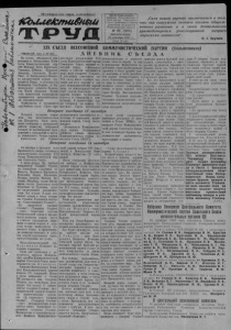 2. „Коллективный труд* 26 октября 1952 годэ, № 86 (1615) Сверх плана Труженики Карасукского промкомбината большой интерес проявляют к материалам X IX съезда партии. Вдохновленные историческими решениями съезда и речью вождя советского народа товарища Сталина, они берут на себя повышенные обязательства, обещают приложить все силы, чтобы производственный план выполнить с превышением. Особенно хороших результатов в работе добился коллектив черепичного завода. По плану завод в 1952 году должен изготовить 150 тысяч штук черепицы. Это задание им выполнено на 3 месяца раньше срока. Добросовестно относятся к выполнению своих обязанностей бригадир цеха тов. Гавриш, мастер тов. Сапета, смазчик тов. Мышанская, обжигальщик Е. Заливчая и другие. Перевыполнили девятимесячный план рабочие цеха пошива обуви и пилорамы. Ежедневно перекрывают задания тт. Мочёный, Нк- коленко, Двадненко, Глазен- ко. Сейчас между рабочими промкомбината развернулось предоктябрьское социалистическое соревнование. Они борются за досрочное выполнение годовой производственной программы в целом по промкомбинату. В.Амбаров, директор промкомбината. Маслоделы Чёрно-Курьи сдержали слово Коллектив работников Чёрно-Курьинского маслозавода брал обязательство— к дню открытия съезда партйи выполнить годовой производственный план. Своё слово он сдержал. На 5 октября завод сдал государству 487 центнеров масла из плана 455 центнеров. 95 процентов масла сдано высшими сортами. Рабочие завода сейчас готовят достойную встречу 35-й годовщине Великого Октября. Воодушевлённые речью товарища И. В. Сталина на X IX съезде партии, они решили до конца года выработать сверх плана 300 пудов масла. И Шевчун, директор маслозавода. Осуществим мероприятия пенсионногообеспечения, трудового устройства и материально-бытового обслуживания семей пенсионеров Обращение участников совещания ак ти ва и внештатных инспекторов Карасукского отдела социального обеспечения Стоящие перед органами социального обеспечения огромные задачи по пенсионному обеспечению, трудовому устройству и материально-бытовому обслуживанию пенсионеров не могут быть успешно выполнены без активного участия и помощи советской общественности. Учитывая важность решения этой задачи, мы, участники совещания, призываем всех колхозников, рабочих, служащих и интеллигенцию района окружить всенародной заботой инвалидов Отечественной войны п семьи героически погибших советских воинов, отдавших свою жизнь за свободу и независимость нашей Родины. Повседневио поддерживать тесную связь с профместкомамн, опекунскими советами, шефскими комиссиями на предприятиях п учреждениях, участвуя в их практической работе по оказанию материальной помощи семьям пеиспонеров. Считать важнейшей задачей общественности выполнение закона о всеобщем семилетием обучении детей, не допуская ни одного случая отсева учащихся из школ. Добиться возобновления деятельности колхозных касс взаимопомощи в каждой ^сельхозартели, вовлекая в её ряды всех членов колхоза. Укрепить материальную базу касс взаимопомощи путем регулярного сбора вступительных и членских взносов, подчинив всю пх работу интересам колхозного производства. Взять на полное содержание кассы в порядке патронирования в семьи колхозников всех детей-сирот, не имеющих родственников п доходов от л