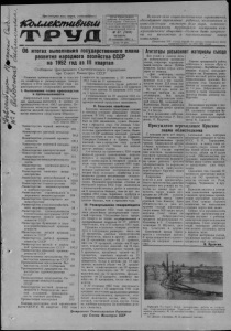 Пролетарии всех стран, соединяйтесь! i&uue&muSH$ui Великая сила социалистического соревнования, единодушное стремление рабочих, колхозников и интеллигенции отстоять дело мира, непоколебимая решимость трудящихся построить коммунистическое общество-должны быть направлены на выполнение и перевыполнение новой- пятилетки. (Директивы XIX съезда партии по пятому пятилстнему плану развития СССР на 1951-1955 годы).__________ Об итогах выполнения государственного плана развития народного хозяйства СССР на 1952 год за III квартал . Сообщение Центрального Статистического Управления при Совете Министров СССР Развитие промышленности и сельского хозяйства и развертывание товарооборота в I l l -м квартале 1952 года х а рактеризуются следующими данными: I. Выполнение плана производства в промышленности Квартальный план производства валовой продукции выполнен в делом по промышленности на 100,7 процента. О т дельными министерствами план производства валовой продукции промышленности выполнен следующим образом: Процент выполнения квартального плана за III квартал 1952 г. Министерство черной металлургии 103 Министерство цветной металлургии 99,9 Министерство угольной промышленности 100,1 Министерство нефтяной промышленности 100,8 Министерство электростанций 100,1 Министерство химической промышленности 101 Министерство электропромышленности 102 Министерство промышленности средств связи 101 Министерство тяжелого машиностроения 99,2 Министерство автомобильной и тракторной промышленности 100,8 Министерство станкостроения 100 Министерство машиностроения и приборостроения 100,1 Министерство строительного и дорожного машиностроения 104 Министерство транспортного машиностроения 93 Министерство сельскохозяйственного машиностроения 94 Министерство промышленности строительных материалов С С С Р 99,7 Министерство лесной промышленности СС С Р 92 Министерство бумажной и деревоперерабатывающей промышленности 104 Министерство легкой промышленности С С С Р 101 Министерство рыбной промышленности С С С Р 95 Министерство мясной и молочной промышленности С С С Р 100,2 Министерство пищевой промышленности СС С Р 105i Промышленные предприятия Министерства хлопководства С С С Р 83 Промышленные предприятия Министерства путей сообщения Промышленные предприятия Министерства здравоохранения СС С Р Промышленные предприятия .Министерства кинематографии СС С Р Министерства местной промышленности п Министерства местной топливной промышленности союзных республик Промысловая кооперация Валовая продукция всей ности С С С Р в 111 квартале выросла по сравнению с I I I кварталом 1951 года на 11 процентов. Производительность труда рабочих в промышленности возросла в I I I квартале 1952 года против I I I квартала 1951 года на б процентов. Установленное на I I I квартал 1952 года задание по снижению себестоимости промышленной продукции выполнено. II. Сельсное хозяйство Колхозы , машинно-тракторные станции и совхозы успешно завершают уборку урожая. В 1952 году валовой урожай зерна составил 8 миллиардов пудов, т . е. был па 600 миллионов пудов больше, чем в прошлом году . По данным Главной государственной инспекции по определению урожайности при Совете Министров СС С Р наиболее высокий урожай зерна получен в этом году на Украине, Северном Кавказе и в Крыму. Более высокий, чем в прошлом году урожай зерновых получен также во многи