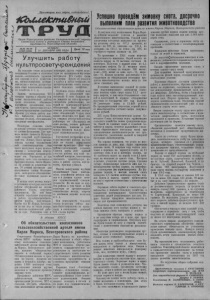 2 . Коллективный труд“ 11 декабря 1952 года, № 98-99 (1627-1628) Районное собрание комсомольского актива Не замазывать ошибки, Состоялось районное собрание комсомольского актива, на котором был заслушан чобсужден доклад секретаря РК КПСС тов. Ситникова об итогах XIX съезда партии. Тов. Ситников отметил историческое значение решений съезда, речи товарища И. В. Сталина и его гениального труда «Экономические проблемы социализма в СССР» для молодежи нашей страны. Он призвал комсомольцев быть в первых рядах строителей коммунизма, своим самоотверженным трудом увлекать молодежь на досрочное выполнение пятой сталинской пятилетки. Докладчик остановился также на недостатках в работе комсомольских организаций, подсказал пути их устранения и поставил очередные задачи, вытекающие из решений XIX. съезда партии. Особое внимание было уделено улучшению идеологической работы среди молодежи. В прениях по докладу выступило 11 человек. Секретарь комсомольской организации колхоза «Пятилетка» тов. Бабурин рассказал о работе комсомольцев на животноводческих фермах. —На фермах мы организовали посты комсомольскою контроля,—сказал он.—Они следят за правильностью расходования кормов, за соблюдением распорядка дня по уходу за скотом. Силами комсомольцев и молодежи для культурного отдыха животноводовоборудованы красные уголки. —В колхозе «Ж‘ ол Сталина» насчитывается 50 комсомольцев,—сказала член райкома ВЛКСМ тов. Шестакова.—Все важнейшие работы в колхозе в основном выполняются молодежью. За достигнутые успехи в социалистическом соревновании многие комсомольцы награждены похвальными грамотами. Но плохо то, что партий пая организация колхоза не интересуется жизнью молодежи. На отчетно-выборном комсомольском собрании ни один из коммунистов не присутствовал, не посчитал нужным побывать на нем и секретарь парторганизации т. Жанжакснн. За два года парторганизация ни разу не заслушала отчет секретаря комсомольской организации о состоянии работы. Член райкома комсомола тов. Остапенко говорил о том, чтов колхозе «Красный путиловен» вот ужо третий год, как комсомольцы нигде не учатся. Нынче организован политкружок, утвержден пропагандист. Но до снх пор ещё не проведено нп одного занятия. Такое положение с учёбой нисколько пе беспокоит секретаря комсомольской организации тов. Денисова. Не принял необходимых мерпо налаживанию этого важнейшего участка работы и райком комсомола. Справедливый упрек в адрес правления колхоза имени Андреева сделал секретарь комсомольской организации тов. Филипенко. —Комсомольцам и молодежи но созданы условия для учебы п отдыха,—заявил он,—В полеводческих бригадах и на животноводческих фермах не выделены помещения для красных уголков, нет библиотеки. 1равда,в артели естьб радиоприёмников, но все они неисправимо. Секретарь комсомольской ор- гагшзццц депо железнодорожной станции Карасук тов. Березанский рассказал, как у них организовано изучение материалов XIXсъезда партии: —Каждую неделю в среду после рабочего времени комсомольцы собираются вместо н читают материалы съезда. Затем начинается оживлённое обсуждение прочитанного, где уточняются всо непонятные вопросы. Собрание комсомольского актива приняло постановление, в котором единодушно одобрило решения XIX съезда партии и обязало членов ВЛКСМ организовать 