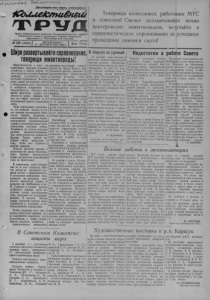 > ^ o u a e ^ i о и д \Л А А О ^ п Л п < ^О и „ Пролетарии всех стран, соединяйтесь! - iCbuue/cm uSHCUi Орган Карасукского райком а Коммунистической партии Советского Союза и районного Совета депутатов трудящихся, Новосибирской области. N- 100 (1 6 2 9 ) I 14 ДЕв °АБрРяЕ^ ^ Г О Д А I Иена 10 нопШиреразвертывайтесоервнование товарищи животноводы! и Товарищи колхозники, работники МТС совхозов! Смелее подхватывайте почин в Венгеровских животноводов, вступайте социалистическое соревнование за успешное проведение зимовки скота! Животноводство — одна пз важнейших отраслей сельского хозяйства в нашем районе. От него колхозы получают большие прибыли, улучшается благосостояние трудящихся. Поэтому очень валена постоянная забота а непрерывном росте поголовья и всемерном повышении его продуктивности. Большое внимание животным должно уделяться во время зимовки, так как это самый трудный и ответственный период содержания скота. Опыт передовиков показывает, что каждый колхоз и совхоз посилон организовать образцовую зимовку. Например, в сельхозартели «Красное знамя» своевременно отремонтировали старые и построили новые ското- помощения, поделали стойла. Ухаживать за скотом поручено лучшим производственникам. Для скота достаточно припасено фуража. Члены артели все усилия сейчас прилагают к тому, чтобы сено подвезти к местам зимовкп. Неплохо проходит зимовка в сельхозартели пмонп Молотова. Здесь бережно расходуются корма, организован надлежащий уход за животными. К сожалению, такое положение не во всех колхозах. Многие артели не проявляют должной заботы о животноводство. В результате помещения своевременно не утеплены, ощущается недостаток кормов. В колхозах пм. Куйбышева и им. М. Горького в первые месяцы стойлового периода грубо нарушены планы расходования сена, допущено его растранжиривание. В колхозе «Новая семья» отдельные группы скота содержатся в холодных я необорудованных помещениях. Чтобы сохранить весь скот в период длительной зимовки, надо напряжённо поработать всем колхозникам, а также специалистам сельского хозяйства. Замечательную инициативу проявили колхозники сельхозартели им. Карла Маркса, Венгеровского района, взявшие социалистические обязательства сохранить поголовье скота и повысить его продуктивность. Они обратились ко всем колхозникам, работникам совхозов и специалистам сельского хозяйства области последовать их примеру. Обязательства венгеровцев опубликованы в нашей газете за 11 декабря ,1952 года. Их призыв отвечает кровным интересам всех колхозов и совхозов. Несомненно, что их инициатива будет подхвачена всеми работниками животноводства района. Партийным организациям колхозов, МТС и совхозов предт стоит повсеместно организовать широкое соревнование, возглас вить его л руководить им повседневно. К этому важному делу надо подойти со всей серьёзностью. Партийные п комсомольские организации должны помочу животноводам в разработке коллективных и индивидуальных социалистических обязательств и в претворении их в жизнь. 30 ноября в газете «Коллективный труд» были опубликованы обязательства комсомольцев и молодёжи совхоза им. Дзержипского. Бюро РК ВЛКСМ одобрило хорошее начинание и предложило всем комсомольским организациям обсудить его на собраниях и включиться в социалистическое соревнование за сохранение поголовья 