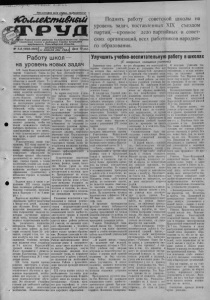 Пролетарии всех стран, соединяйтесь! 1СЬиие&пи£н$ш г ан Карасукского райкома Коммунистической партии Советского Союза и районного Совета депутатов трудящихся, Новосибирской области. т 5 -6 (1 6 3 8 -1 6 3 9)|„ ЯВ^ Л Р Я С,1%ЬВГ0ДА Цена 10 ноп. Поднять работу советской школы на уровень задач, поставленных XIX съездом партии,—кровное дело партийных и советских организаций, всех работников народного образования. Работу школ — на уровень новых задач XIX съезд Коммунистической партии Советского Союза наметил величественную программу коммунистического строительства в нашей стране. Товарищ Сталин учит, что одним из предварительных условий подготовки перехода к коммунизму является необходимость «добиться такого культурного роста общества, который бы обеспечил всем членам общества всестороннее развитие их физических и умственных способностей, чтобы члены общества имели возможность получить образование, достаточное для того, чтобы стать активными деятелями общественного развития, чтобы они имели возможность свободно выбирать профессию, а не быть прикованными на всю жизнь, в силу существующего разделения труда, к одной какой-либо профессии». Руководствуясь этими указаниями, XIX съезд партии поставил задачу—завершить к концу пятилетки переход от семилетнсго образования на всеобщее среднее образованно (десятилетка) во многих крупных городах страны, а также подготовить условия для полного осуществления в следующей пятилетке всеобщего среднего образования (десятилетка) в остальных городах и сельских местностях. Задачам школ в связи с решениями XIX съезда партии было посвящено районное учительское совещание, проходившее в Карасуке с б по 8 январи с. г. Переход на всеобщее среднее образование требует вовлечения в школу всех детей, подлежащих обучению. Итоиг первого полугодия показывают, что в этом направлении имеются некоторые улучшения: выросло число школ, которые добились полного осуществления всеобуча, увеличилось количество интернатов. Однако тот факт, что из школ района за полугодие отсеялось более 50 учащихся, говорит о том, что закон всеобуча все еще. не выполняется. Особенно нетерпимым является отсев учащихся из 8-х классов Карасукской средней школы (28 человек). Плохо справляются с этими задачами Калачинская, Благодатская и Карасукская № 1 семилетние школы. XIX съезд партии принял решение приступить к осуществлению в средней школе политехнического обучения и проведению мероприятий, необходимых для перехода к всеобщему политехническому обучению. Это обеспечит учащимся условия для свободного выбора профессии поело окончания десятилетки. Политехническое обучение будет осуществляться на базо систематического и прочного усвоения учащимися основ наук. Отсюда перед учительством встает задача дальнейшего повышения качества учебно-воспитательной работы в школах. За первое полугодие в школах района оказалось более 25 процентов неуспевающих учащихся. Это показывает, что во многих школах состояние учебно-воспитательной работы все еще но отвечает предъявляемым требованиям. Особенно низка успеваемость по русскому языку. Преподаватели этого предмета 'не добиваются от учащихся сознательного усвоения правил, грамматических категорий, не проводят анализа . смыслового значения слов. Неудовлетворительно ведется словарная работа, осо