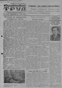 2. „Коллективны! труд1 1 февраля 1953 года № 11 (1644) Кандидаты в депутаты Карасукского поселкового Совета Окружные избирательные комиссии зарегистрировали следующих кандидатов в депутаты Карасукского поселкового Совета депутатов трудящихся: Вставсний Василий Андреевич, рождения 1914 года, член КПСС, сотрудник районного отделения МГБ. Выдвинут общим собранием рабочих и служащих Карасукского районного отделения МГБпо Октябрьскому избирательному округу № 1. Кудрявцев Пётр Михайлович, рождения 1921 года, беспартийный, кузнец Карасукского рыбозавода. Выдвинут общим собранием рабочих и служащих Карасукского рыбозавода по Алыбаевскому избирательному округу Лё 2. ПыряеваАнтонина Николаевна, рождения 1931 года, член ВЛКСМ, помощник энтомолога Караеунекой санэпидстанции. Выдвинута коллективом работников райздравотдела по Демья- но-Бедного избирательному округу № 3. Вятмина Мария Степановна, рождения 1927 года, беспартийная, кредитный инспектор Карасукского отделения Госбанка. Выдвинута коллективом работников Карасукского отделения Госбанка по Демьяно- Бедного избирательному округу № 4. Рубио Марфа Матвеевна, рождения 1914 года, беспартийная, транспортерщик Карасукского пункта «Заготзерно». Выдвинута общим собранием рабочих п служащих Карасукского пункта «Заготзерно» по Луначарскому избирательному округу № 5. Медведно Степан Петрович, рождения 1923 года, член КПСС, директор Карасукской семплет- ней школы № 2. Выдвинут коллективом учителей Карасукской семилетней школы №2 по Ворошиловскому избирательному округу № 6. Карнюшин Николай Григорьевич, рождения 192Gгода, член ВЛКСМ, сотрудник Карасукского райвоенкомата. Выдвинут общим собранием рабочих н служащих райпищекомбпната по Комсомольскому избирательному округу № 7. Тарасова АннаВасильевна, рождения 1900 года, беспартийная, домохозяйка. Выдвинута общим собранием членов промысловой артели инвалидов «Путь к труду» по Кагановпч- скому избирательному округу № 8. Кузнецов Тимофей Васильевич, рождения 1906 года, член КПСС, старший механик связи железнодорожной ст. Ка- расук. Выдвинут общим собраниемрабочих и служащихжелезнодорожной ст. Карасук по Железнодорожному избирательному округу № 9. Нинонов Андрей Петрович, рождения 1919 года, член КПС , исполняющий обязанности председателя исполкома Карасукского поселкового Совета депутатов трудящихся. Выдвинут коллективом учителей Карасукской начальной школы № 3 по Привокзальному избирательному округу № 10. Бондаревсний Иван Васильевич, рождения 1917 года, член КПСС, исполняющий обязанности заместителя председателя райисполкома. Выдвинут общим собранием рабочих и служащих Карасукского пункта | «Заготзерно» по Сталинскому избирательному округу № 11. Мальцев Иван Иванович, рождения 1912 года, член КПСС, председатель артели «Энергия». Выдвинут общим собранием членов промысловой артели «Энергия» по Почтовому избирательному округу № 12. уЧоновсная Александра Даниловна, рождения 1918 года, член КПСС, заведующая Карасукской начальной школой № 3. Выдвинута общим собранием коллектива учителей Карасукской начальной школы № 3 по Карасукскому избирательному округу № 13. Денисенно Прокофий Кузьмич, рождения 1912 года член КПСС,директор Карасукского лесоторгового склада. Выдвинут общим собранием членов промысловой артели «Энергия» по Майскому избират