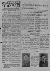Пролетарии всех стран, соединяйтесь! 1СоилеШпы£нб1й Т Р У Д Орган Карасукского райкома Коммунистической партии Советского Союза и районного Совета депутатов трудящихся, Новосибирской области. N* 13 (1646 )\ ВОСКРЕСЕНЬЕ, 8 ФЕВРАЛЯ 1953 ГОДА Цена 10 ноп. Выборы в Советы являются подлинно всенародными, свободными, демократическими. Советские люди продемонстрируют на них свою сплоченность и безграничное доверие Коммунистической партии и Советскому правительству. Советы депутатов трудящихся— органы государственной власти Народы нашей страны готовятся к выборамв местные Советы депутатов трудящихся. 22 февраля 1953 года состоятся выборы в краевые, областные, окружные, районные, городские, сельские н поселковые Советы ' депутатов трудящихся Российской Федерации. Па тот же день назначены выборы в местные Советы Украинской, Белорусской, Грузинской, Литовской, Эстонской и Молдавской ССР. 1 марта к избирательным урнам придут трудящиеся Латвийской, Киргизской, Туркменской, Таджикской, Узбекской, Карело- финской, Казахской и Армянской ССР. На 15 марта назначены выборы вместные Советы в Азербайджанской ССР. Советы представляют собой новый, высший тип организации государственной властп, политическую основу Союза Советских Социалистических Республик. В условиях буржуазногостроя трудящиеся массы отстраняются отуправления государством, от участия вполитической жизни, от пользования демократ; ческимп правами. В условиях же диктатуры пролетариата они, наоборот, привлекаются через Советы к постоянному управлению государством. В 1950 году только в местные Советы было избрано около 1.500 тысяч депутатов, в том числе свыше полумиллиона женщин. Советская власть—не только Ь- наиболее массовая п наиболее г демократическая государственная организация. Советская власть также и наиболее интернационалистская пз всех государственных организаций. Она разрушила до основания всю систему национального гнета и обеспечила фактическое участие трудящихся всех наций в строительстве новой жизни. Советский строй дал невиданные ранее формы государственной организации— советские национальные республики, национальные области п округа. Советская власть— подлинно народная власть," п этим она коренным образом отлпчаетгя от буржуазной властп, которая не имеет опоры в массах. Муниципалитеты, магистраты и другие местные органы буржуазных государств не защищают интересы трудящихся, а наоборот, способствуют их угнетению. В США и других капота- лпстпческпх странах они, например, помогают преследовать коммунистов п прогрессивных деятелей. Местные Советы депутатов трудящихся коренным образом отличаются от этих антинародных бюрократических органов буржуазных государств. Местные Советы являются неотъемлемой чдетыо единой системы государственной властп п поль-- зуются широкими правами в государственном управлении. Они руководят деятельностью подчиненных иморганов управления, обеспечивают охрану государственного порядка, соблюдение законов иохрану прав граждан, устанавливают местный бюджет. Советы депутатов трудящихся осуществляют руководство местнымхозяйственным пкультурным строптельством, заботятся о наиболее полном удовлетворении материальных и духовных запросов рабочих, крестьян и интеллигенции. Залогом успеха работы местных Советов является тесн