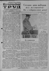 ■ Пролетарии всех стран, соединяйтесь! - 1СЬиЛ£&ти£нш4 Орган К ар а су к ск о го р ай к ом а Коммунистической партии Советского С ою за и рай онн о го Совета депутатов трудящихся, Новосибирской обл аст и . Ы£ 17 / 1 6 5 0)' ВОСКРЕСЕНЬЕ, " и ( /и и и ц 22 ФЕВРАЛЯ 1953 ГОДА Цена 10 ноп. B C E - Н А В Ы Б О Р Ы ! Сегодня великий всенародный праздник—выборы в местные Советы депутатов трудящихся. Ровно в 6 часов утра гостеприимно откроются двери избирательных участков. Трудящиеся района придут к избирательным урнам, чтобы исполнить свой гражданский долг— проголосовать за кандидатов нерушимого сталинского блока коммунистов и беспартийных, за счастье народа, за коммунизм. Советский избиратель с законной гордостью оглядывает путь, пройденный со времени последних выборов в местные Советы. За два прошедших года еще более укрепилось могущество нашей Родины, вырос ее международный автори- ^тет. Советские люди стали богаче, опытнее, культурнее. Наша страна уверенно идет к коммунизму. Величайшим событием в жизни советских людей явился созыв XIX съезда партии. Руководствуясь гениальным произведением товарища Сталина «Экономические проблемы социализма в СССР», его речью, съезд начертал ясную программу строительства коммунизма в нашей стране. Воодушевленные этими решениями, советские люди, еще теснее сплотившись вокруг Коммунистической партии, вождя п учителя, зодчего коммунизма товарища Сталина, широко развернули социалистическое соревнование за досрочное выполнение И1ЯТ0Й сталинской пятилетки. Огромные трудовые победы достигнуты в минувшем году. Об этом свидетельствует Сообщение Главного Статистического Управления о выполнении государственного плана за 1952 год. Достигнутые успехи наполняют сердца советских людей чувством горячей благодарности п безграничной веры коммунистической партии, товарищу Сталину. Эта вера замечательно воплощена в избирательном блоке коммунистов и беспартийных, который всегда побеждал и снова восторжествует на выборах в местные Советы. Подготовка к выборам вылилась в новый политический и трудовой подъём трудящихся. Как и все советские люди, избиратели нашего района подошли к этому дню с новыми производственными подарками матерп-Родине. Славно потрудились члены промысловой артели «Новое производство». Производственную программу двух месяцев они выполнили досрочно, 20 февраля, на 101,2 процента. Завершила выполнение январско-февральского плана артель «Энергия». Здесь штамповщик коммунист т. Шапоренко к 20 февраля дал 4 месячных нормы. G чувством удовлетворения приходят к знаменательной дате хлеборобы колхозов имени Молотоваи «Жол Сталина». Ок-и успешно ведут подготовку к весеннему сову: выполнили на 100 процентов план снегозадержания, очистили семена, завершили ремонт сельхозинвен- таря, успешно ведут сбор местных удобрений. Наступил день, выборов. Сегодня избиратели используют свое право, предоставленное Сталинской Конституцией, свободно голосовать за кандидатов сталинского блока коммунистов и беспартийных, доверяя им выполнение своих наказов. Товарищи избиратели— все на выборы! Единодушным голосованием за лучших сынов п дочерей народа прославим нашу Родину новой победой советской демократии. Сегодня—день выборов. ВСЕ—НА ВЫБОРЫ! Все—к избирательным урнам! Изберём д о с т о й н ы х Славный праздник всенародный— В
