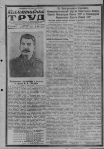 2. Доллектввиь*! tp v * - 7 марта 1953 года № 21 (1654) | Иосиф Виссарионович Сталин j Об образовании Комиссии по организации похорон Председателя Совета Министров Союза Советских Социалистических Республик и Секретаря Центрального Комитета Коммунистической партии Советского Союза Иосифа Виссарионовича Сталина Совет Министров Союза ССР и Центральный Комитет Коммунистической партии Советского Союза ПОСТАНОВИЛИ: Образовать комиссию по организации похорон Председателя. Совета Министров Союза Советских Социалистических Республик, и Секретаря Центрального Комитета Коммунистической партии Советского Союза Генералиссимуса Иосифа Виссарионовича Сталина в составе тт. Хрущёва Н. С. (Председатель), Кагановича Л. М., Шверника Н. М., Василевского А. М., Пегова Н. Н., Артемьева П. А., Яснова М. А. От Комиссии по организации похорон Председателя Совета Министров Союза Советских Социалистических Республик и Секретаря Центрального Комитета Коммунистической партии Советского Союза Иосифа Виссарионовича Сталина Гроб с телом Иосифа Виссарионовича Сталина установлен в Колонном зале Дома Союзов. Доступ в Колонный зал Дома Союзов открыт с 4 часов дня 6 марта. ВЕЛИКАЯ СКОРБЬ ТРУДЯЩИХСЯ РАЙОНА Слово колхозников Глубоко опечалило известно о смерти гениального продолжателя дела Ленина, мудрого вождя и друга колхозного кр е с т ь я н к а Иосифа Виссарионовича Сталина колхознн- кон-казахов сельхозартели «Жол Сталина». — Смерть товарища Сталина— величайшая утрата для всего прогрессивного человечества,— говорит заместитель председателя колхоза т. Сраплов на траурном собрании.— Мы, колхозники-казахи, повседневно ощущали отеческую заботу великого вождя. С именем дорогого Иосифа Виссарионовича казахский народ победил вековую отсталость, приобщился к передовой культуре братского русского народа, с именем товарища Сталина мы будем решать все великие и малые дела. Аксакал Калаб Ватепов со слезами на глазах выразил скорбь по случаю еме.ртп товарища И. В. Сталина п, как работник животноводства, заявил, что он, несмотря на преклонный возраст, отдаёт все сплыдля сохранения колхозного скота. Бригадиры полеводческих брпгад Тугаев Андарбек п Тс- зекпаев Айкоза выразило мнения колхозников, заявив, что в эти скорбные дни они ещё теснее сплотятся вокруг Коммунистической партии, основателем и руководителем которой вместо с В. И. Лениным был товарищ И. В. Сталин. -Велика утрата, велика скорбь,— говорит пожилой колхозник Арын Койчубаев. —Трудно поверить тому, что от нас ушёл товарищ Сталин. Мы сохраним его имя в сердцах и обессмертим его дела. Вместе со всем советским народом мы. колхознекп-казахи, будем ак тпвно участвовать в выполнении планов, начертанных великим Сталиным. Колхозники сельхозартели «Жол Сталина» послали письмо Центральному Комитет' КПСС, Совету Министров СССР и Президиуму Верховного Совет; Союза ССР, в котором заявили, что они к 10 марта закончат комплексную подготовку к весеннему севу, проведут ег< в сжатые срокп, на высоко» агротехническом уровне п до Оьются новых успехов в повы шенпи урожайности полей и i развитии животноводства. Т. ГВОЗДЕВ. Б О Л Ь Ш О Е Г О Р Е Весть о смерти велик ого вождя советского народа и все- го прогрессивного человечества Иосифа Внссарионовпча Сталина глубоко потрясла рабочих, служащих н инженерно-технических работников Ка