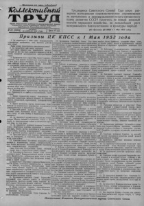 Пролетарии всех стран, соединяйтесьI 'КЬилекшивнпй Орган Карасукского райкома Коммунистической партии Советского Союза и районного Совета депутатов трудящихся, Новосибирской области. № 3 6 (1669) | ЧЕТВЕРГ, 23 АПРЕЛЯ 1953 ГОДА I Цена 10 ноп. Трудящиеся Советского Союза! Еще шире развернем всенародное социалистическое соревнование за выполнение и перевыполнение пятого пятилетнего плана развития СССР! Боритесь за новый мощный подъём народного хозяйства, за дальнейший рост материального благосостояния и культуры народа! (Из Призывов ЦП НПСС н 1 Мая 1953 года) Пр и зы вы ЦККПСС к 1 Ма я 1953 г 1. Да здравствует 1 Мая— день международной солидарности трудящихся, день братства рабочих всех стран! Выше знамя пролетарского интернационализма! 2. Да здравствует мир между пародами! Нет такого спорного или нерешенного вопроса, который не мог бы быть разрешен мирным путем на основе взаимной договоренности заинтересованных стран! 3. Трудящиеся всех стран! Мир будет сохранен и упрочен, если народы возьмут дело сохранения мира в свои руки и будут отстаивать его до конца! Крепите единство народов в борьбе за мир, умножайте и сплачивайте ряды сторонников мпра! 4. Братский привет трудящимся стран, народной демократии, успешно строящим социализм! Да здравствует п крепнет нерушимая дружба п сотрудничество народно-демократических стран и Советского Союза! 5. Братский привет великому китайскому народу, достигшему ноеых успехов в строительстве могучего народно-демократического китайского государства! Пусть крепнет и процветает велпкая дружба Китайской Народной Республики и Советского Союза— прочная опора мира и безопасности на Дальнем Востоке и во всем мире! 6. Братский привет героическому корейскому народу, борющемуся за щшбоду и независимость своей Родины! Т. Привет германскому народу, борющемуся за скорейшее заключение мирного договора, за создание единой, независимой, миролюбивой, демократической Гер мании! 8. Привет японскому народу, мужественно борющемуся за национальное возрождение, независимую, демократическую и миролюбивую Японию! 9. Братский привет народам колониальных п зависимых стран, борющимся против империалистического гнета, за свою свободу и национальную независимость! 10. Да здравствует дружба народов Англии, Соединенных Штатов Америки и Советского Союза в пх борьбе за предотвращение войны и обеспеченно прочного мира во всом мире! 11. Да здравствует внешняя политика Советского Союза— незыблемая политика сохранения и упрочения мира, борьбы против подготовки п развязывания новой войны, политика международного сотрудничества и развития деловых связей со всеми странами! 12. Братскпй привет всем народам, борющимся за мир, за демократию, за социализм, против поджигателей новой войны! 13. Советские воины! Настойчиво повышайте свои военные п политические знания, совершенствуйте свое боевое мастерство! Неустанно крепите оборонную мощь социалистического государства! ( лава Советским Вооруженным Силам, стоящим на страже мира и безопасности нашей Родины! 14. Трудящиеся Советского Союза! Еще теснее сплотимся вокруг Коммунистической партии и Советского Правительства, мобилизуем наши силы и творческую энергию на великое дело построения коммунизма в нашей стране! Да здравствует нерушимое единение Коммунистической партии, Советского Правител
