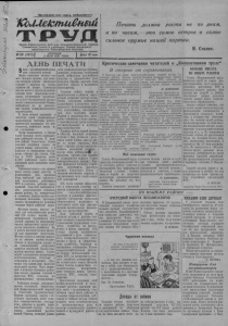 Пролетарии всех стран, соединяйтесь1 Печать должна расти не по дням, Т Р У Д Орган Карасукского pa in ома Коммунистической партии Советского Союза и районного Совета депутатов трудящихся , Новосибирской области. № 3 9 (1672jj 5 м а я ™ ™ 'г о д а | ЦенаЮкоп. ЛЕНЬ ПЕЧАТИ мая— традиционный праздник советской печати. Наша советская печать— самое сильное оружие, при помощи которого партия ежедневно говорит с народом на своем, нужном ей языке. Советская печать несет в массы всепобеждающие идеи марксизма-ленинизма, воспитывает трудящихся в духе безграничной преданности социалистической Родине, мобилизует их на выполнение планов коммунистического строительства. В День печати редакции и читатели газет подытоживают проделанную газетами работу, критически оценивают их деятельность, намечают меры по их улучшению. Среди издающихся в стране газет большое место принадлежит районной печати. В каждом районе Советского Союза выходит печатная газета на родиом языке населения, а в районах со смешанным населением— обычно две газеты. Сейчас в СССР издастся около 4.500 районных газет— более половины всех печатных газет страны. Районная газета— это прежде всего газета самих рабочих и колхозников. Она призвана быть трибуной для выступлений колхозников, работников МТС и совхозов, рабочих предприятий, сельской интеллигенции, разносторонне освещать жизнь района, на конкретных и понятных фактах идейно воспитывать население, организовывать трудящихся на решение стоящих перед районом задач. Местная печать многое делает для популяризации решений XIX съезда партии, для мобилизации трудящихся колхозной деревпи па выполнение пятого пятилстнего плана в области сельского хозяйства. По в работе местной печати имеются еще серьезные недостатки. Многие статьи и заметки пишутся на низком идейно-политическом и культурном уровне и не удовлетворяют возросших запросов читателей. Плохо освещается местная жизнь. Газета порой заполняется различными постановлениями, отчетами о собраниях п заседаниях, утрачивая тем самым лицо массовой колхозной газеты. Мало внимания и помощи оказывает районная печать стенным газетам в колхозах, МТС, совхозах, на промышленных предприятиях. Районная печать руководствуется политикой, выработанной Коммунистической партией и Советским правительством. Партия поставила задачу —неустанно укреплять наше великое социалистическое государство, единство и дружбу народов Советской страны, 'обеспечивать дальнейший расцвет нашей Родины, всемерно развивать социалистическую промышленность, укреплять колхозный строй, добиваться дальнейшего подъема и процветания всех колхозов страны, крепить союз рабочего класса и колхозного крестьянства. Главная забота партии и правительства в области внутренней политики состоит в том, чтобы неуклонно добиваться дальнейшего улучшения материального благосостояния рабочих, колхозников, интеллигенции, всех советских людей. Партия и правительство неослабно заботятся о благо народа, о максимальном удовлетворении его материальных и культурных потребностей. Главная забота нашей партии в области внешней политики состоит в том, чтобы но допустить новой войны, жить в мире со всеми странами. Паш долг—-хранить и укреплять величайшее завооваипе народов— лагерь мира, деигократи!»*! социализма, крепить узы д