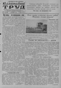 Пролетарии всех стран, соединяетесь1 l&UJjzIcmuCMui Т Р У Д Орган Карасукского райкома Коммунистической партии Советского Союза и районного Совета депутатов трудящихся, Новосибирской области. №41 (1674)\ ЧЕТВЕРГ 14 МАЯ 1953 ГОДА Цена 10 ноп. Товарищи хлеборобы! Наступили решающие дни весенне-полевых работ. Необходимо максимально использовать каждый час рабочего времени для завершения сева всех культур в лучшие сроки. Все силы—на завершение сева! Всесилы— назавершеенсеива Борясь за выполнение главной задачи в сельском хозяйстве, поставленной XIX съездом Коммунистической партии Советского Союза, труженики нашего района взяли обязательство-—провести весенний сев в лучшие агротехнические сроки и с хорошим качеством работ, получить урожай пшеницы не менее 14 центнеров с гектара. Многие полеводческие п тракторные бригады крепко держат свое слово. Например, тракторная бригада инициатора областного соревнования механизаторов Ф.М. Семеннхпца, работающая на полях колхоза имени Молотова, еще 8 мая выполнила доведенный план сева яровых культур, семенные участки засеяла перекрестным способом. Кроме того, бригада посеяла 200 гектаров сверх задания. Закончили сев колхозы имени Куйбышева, «Пятилетка». Досрочно выполнили обязательства механизаторы бригад коммуниста т. Гуриненко, т. Барило и многие другие. Так могут и должны трудиться все. Однако итоги работы на 13 мая показывают, что в целом по району обязательства далеко нс выполнены. В ряде колхозов до сих нор продолжают оставаться крупные недостатки в проведении весенних полевых работ. В результате—растягиваются сроки сева, нарушаются правила агротехники. Нто наблюдается в колхозах «Путь Ленина», «Жол Сталина», «Красное знамя». Правления этих колхозов п руководители МТС безразлично относятся к работе тракторных бригад, не обеспечили их полностью обслуживающим персоналом. По этой причине машины используются непроизводительно, допускаются частые их простои п некачественная обработка земли. Директор Карасукской МТС т. Бурдиков п его заместитель по политчасти т. Тпторенко в горячую пору полевых работ редко бывают в бригадах, не оказывают механизаторам практической помощи в организации труда и социалистического соревнованпя. Механпкп станции не борются за ликвидацию простоев тракторов потехническим неисправностям Срывает договорные обяза- тельства с сельхозартелью имени Сталина Хорошннская МТС. Несмотря на то, что этот колхоз является семеноводческим, сроки сева основной культуры —пшеницы срываются. Но вине станции сюда еще не прибыли два намеченных трактора. ДпрШщгГ Студеновской МТС и специалисты сельского хозяйства мало интересуются работойтрактористов в ночные смены. Поэтому допускается брак в работе, невыполнение норм. Например, в бригаде т. Чече- ткпна в ночь на 10 мая трактористы Балде и Герпнгер производили предпосевное лущение в одной загонке, обрабатывали землю мелко, с огрехами. Очень медленно ведется в районе посев кормовых культур. А такие колхозы, как «Красное знамя», имени Буденного и некоторые другие к севу их еще совсем не приступали. Затягивают сроки сева многолетних трав колхозы имени Дзержипского и имени Молотова. Техническая оснащенность МТС, колхозов п совхозов, а также обеспеченность пх специализированными кадрами позволяют в этом году успешно заложить осн