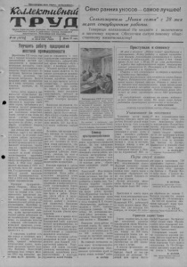 Пролетарии всех стран, соединяйтесьi KbUJekmuiCumi Сено ранних уносов—самое лучшее! Т Р У Д Орган Ьорасукско го р айком а Коммунистической партии Советского Союза и районного Совета депутатов трудящихся , Новосибирской области. №46 (1679у| ВОСКРЕСЕНЬЕ, 31 МАЯ 1953 ГОДА Цена 10 ноп. Сельхозартель „Новая семья“ с 28 мая ведет сеноуборочные работы. Товарищи колхозники! Не медлите с включением в заготовку кормов. Обеспечим сытую зимовку общественному животноводству! Улучшить работу предприятий местной промышленности Директивами XIX съезда партии в текущей пятилетке перед предприятиями местной промышленности и промысловой кооперации поставлена задача значительного расширения производства товаров массового потребления, предметов домашнего обихода, различных строительных материалов. Выпуск продукции этими предприятиями к концу пятилетки увеличивается, примерно, на 60 процентов. Сейчас, когда партия и правительство осуществляют широкую программу дальнейшего подъёма материального благосостояния и культуры советского народа, требования к работникам местной промышленности н промысловой кооперации значительно возрастают. Задача состоит в том, чтобы не только успешно выполнять установленные планы выпуска продукции по обч.ёму, но расширять ассортимент товаров, повышать их качество. Для выполнения этих ответственных задач у нас имеются вес условия. За последние годы в нашем районе значительно расширилась сеть предприятий местной промышленности и промысловой кооперации, укрепилась их производственно-техническая база. Государство оснащает их новой техникой, механизируются трудоёмкие процессы. Объем выпускаемой продукции возрастает с каждым годом. В 1952 году прирост валовой продукции к 1951 году соетавил около 40 процентов. Государственные планы по выпуску валовой продукции местной промышленностью в 1951 и 1952 году были значительно перевыполнены. Передовые предприятия— артели «Энергия», «Новое производство», райпищекомбииат стали на твердый путь систематического выполнения плановых заданий. Здесь созданы все необходимые условия для производительной работы производственников. Партийные организации возглавляют социалистическое соревповапие рабочих, наём массово-разъяснп- тельной работы мобилизуют их на перевыполнение норм выработки, на повышение качества и снижение себестоимости выпускаемой продукции, ускорение оборачиваемости оборотиых средстз и т. д. К сожалению, в районе есть еще немало и отстающих предприятий, которые работают плохо, срывают выполнение установленных планов, производят продукцию низкого качества. Например, Карасукекпй рыбозавод план четырех' месяцев 1953 года выполнил всего лишь на 34 процента. Далеко не справляются с государственными заданиями артель «Заготовитель», райпромкомбп- нат, артель инвалидов «Путь к труду» и некоторые другие.» Основной причиной невыполнения пчанов является то, что многие руководители предприятий, инженерно-технические работники, партийные организациине перестраивают работу в соответствии с требованиями решений XIX съезда партии, нс вводят в действие новые мощности, плохо используют существующие, работают "по «старинке», не прислушиваясь к голосу новаторов производства. Некоторые предприятия становятся на путь невыполнения плана в установленном ассортименте. Артели «Заго