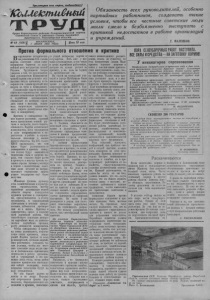 Пролетарии всех стран, соединяйтесьI ЖЬилекжшвншл Т Р У Д Орган Карасукского райкома Коммунистической партии Советского Союза и районного Совета депутатов трудящихся, Новосибирской области■ _____ № 4 8 (1681) I ВОСКРЕСЕНЬЕ, 7 ИЮНЯ 1953 ГОДА Цена 10 ноп. Обязанность всех руководителей, особенно партийных работников, создавать такие условия, чтобы все честные советские люди могли смело и безбоязненно выступать с критикой недостатков в работе организаций и учреждений. Г. МАЛЕНКОВ. * Против формального отношения к критике ЛОРА СЕНОУБОРОЧНЫХ РАБОТ НАСТУПИЛА, ВСЕ СИЛЫИСРЕДСТВА-НА ЗАГОТОВКУ КОРМОВ! У инициаторов соревнования Напряженно потрудились в прошлом году в дни сено- j коса труженики колхоза „Красное знамя". Благодаря j этому зимовка проведена успешно. Нынче члены арте- j ли решили на каждую условную голову крупного рога- * того скота заготовить по 35 центнеров грубых кормов. На обширных артельных угодьях поспевает трава. В отдельных местах она уже созрела, набрала цвет. С 3 июня колхоз ведет выборочную косовицу. На лугах первой полеводческой бригады работают сенокосилки комсомольцев Ф. Чумакова, В. Лемешко и В. Кулак. Каждый из них с первого дня скашивает более четырех гектаров за смену. Включены в работу все сенокосилки и во второй бригаде. Здесь наивысшей выработки добился машинист М. Шеховцов. Организовано сгребание сена в валки. С 30 гектаров еххая трава уже сложена в копны. ; ^ М. ФЕДОРЕНКО, j председатель сельсовета. СКОШЕНО 200 ГЕКТАРОВ С каждым днем наращиваются темпы на сеноуборке в ! колхозе „Новая семья". ! Сейчас на лугах артели работает И конных сенокоса- \ лок. Во второй полеводческой бригаде коммуниста Н. Не- \ стерова вчера приступил к уборке трав тракторный агре- j гат. Обязанности старшего машиниста агрегата правление ; артели возложило на лучшего производственника В. Кутай- j бергенова. ^ ; Всего мы уже скосили около 200 гектаров угодий. С \ первых дней сенокоса лучше других трудятся машинисты j Ф. Пономарёв и В. Шост. Каждый из них ежедневно ска- I шивает траву на 4,5—5 гектарах, вместо 4 по норме. В колхозе организована бригада скирдовщиков. Она за- j стоговала 380 центнеров сена. П. ОСИПЕНКО, бухгалтер колхоза. j Раскачиваются Вооруженные историческимирешениямиXIX съезда партии, советские люди самоотверженно борются за дальнейший рост могущества нашей Родины. Трудящиеся твердо уверены втом, что под испытанным руководством Коммунистической партии ониуспешно осуществят пятую пятилетку и совершат тем самымкрупный шаг вперед по пути к коммунизму. Грандиозные задачи коммунистического строительства предъявляют повышенные требования к партийным организациям, обязывают их всемерно укреплять связи с массами, поднимать творческую активность масс, широко развёртывая критику и самокритику. Критика и самокритика—закон нашего развития, главный метод преодоления всякой рутины и косности, всего старого, отжившего. Партия воспитывает коммунистов, всех трудящихся в духе непримиримости к недостаткам в работе и отрицательным явлениям в жизни нашего общества. На XIX съезде КПСС указывалось, что чем шире будет развертываться самокритика и критика снизу, тем полнее будут выявляться творческие силы и энергия народа, тем сильнее будет расти и крепнуть в массах чувство хозяина страны. Активно участвуя в борьбе с недостатками, советские люди исходят