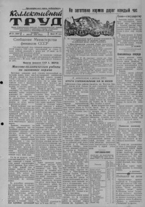 Пролетарии всех стран, соединяйтесь/ Т Р У Д Орган Карасукского райкома Коммунистической партии Советского Союза и районного Совета депутатов трудящихся, Новосибирской области. № 5 4 (1 6 8 7; | 2 ию лЧя ЕТ1В953Г года I Уена ^ нопСообщение Министерства финансов СССР Государственный заем развития народного хозяйства С С С Р (выпуск 1953 года), выпущенный на сумму 15 млрд, рублей, размещён к концу дня 27 июня на 15 миллиардов 343 миллиона рублей. Министром финансов С С С Р , на основании указаний Совета Министров С С С Р , дано распоряжение прекратить повсеместно с 28 июня 1953 года дальнейшую подписку на заём. Министр финансов СССР А. ЗВЕРЕВ. Массово-политическая работа на заготовке кормов На заготовке кормов дорог каждый час в соревновании на заготовке кормов на районную Доску почёта заносятся: 8. Чёрно-Курьинекий сельский Совет (председатель т. Коростылев), колхозы которого выполнили план закладки силоса на 42,2 проц., сенокошения—на 42 проц. 9. Гунам Д .А.—член колхоза „Красное знамя", выполняющий дневные нормы на скирдовке сена на 120 проц. 10. Русаков Леонид— машинист сенокосного агрегата. Сцепом 3-х сенокосилок в колхозе „Красный путиловец" т. Русаков скосил 349 гектаров трав. Декадное задание выполнил на 120 проц. 11. Найманов Т. И.—тракторист совхоза им. Дзержинского, скосивший сцепом 4-х сенокосилок 406 гектаров трав и сэкономивший 56 кг. горючего. При норме 25 гектаров он ежесменно скашивает по 30-40 гектаров. 12. Сагель Давыд—машинист сенокосного агрегата из Октябрьской МТС, скосивший сцепом 4-х сенокосилок в колхозе им. Джамбула 460 гектаров трав. 13. Забеганов А. П.—тракторист из совхоза Октябрь, скосивший сцепом 3-х сенокосилок 600 гектаров трав и сэкономивший 480 кг. горючего. При норме 28 гектаров он ежесменно скашивает до 40 гектаров. В райисполкоме и райкоме КПСС ИТОГИ СОРЕВНОВАНИЯ НА 30 ИЮНЯ Наступили решающпо днп заготовки кормов. Дорог каждый день, каждый час. Задача состоит в том, чтобы мобилизовать все имеющиеся ресурсы, наиболее полно и правильно использовать людские силы, технику, не упустить время. Чтобы успешно провести сеноуборку, эту ответственную кампанию, нужно оперативно руководить ею, привлечь участию в заготовке кормов всё трудоспособное население, организовать среди людей, занятых на лугах, массово- политическую работу. Каждый труженик села должен понять, что заготовка кормов— важнейшая хозяйственно- политическая задача. От напряжённой работы на сеноуборке зависят создание кормовой базы, сохранность поголовья и повышение продуктивности общественного животноводства. Практика показывает, что успеха добиваются там, где партийные организации умело возглавляют трудовую и политическую активность масс, поднимают пх на борьбу за укрепление кормовой базы. Опыт ряда парторганизаций свидетельствует о том, что правильно поставленная массово-политическая работа является мощным средством мобилизации колхозников, работников машинно-тракторных станций п совхозов на решение стоящих перед нпмп задач. Где бы ни трудился сейчас сельский коммунист, он не может оставаться в стороне от столь важной сельскохозяйственной кампании. Надо добиться, чтобы каждый член и кандидат партии на деле выполнял свою передовую роль в колхозе, МТС, совхозе, был организатором, вожаком масс, чтобы коммунисты возглавляли соревнование на заготовке кормов. На дальнейшее ра