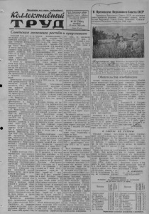 Пролетарии всех стран, соединяйтесь! КЪиле4сти£ншг Т Р У Д Орган Карасукского райкома Коммунистической партии Советского Союза и районного Совета депутатов трудящихся Новосибирской области N* 60 (1693) ЧЕТВЕРГ 23 ию л я 1953 года _ _____Цена 10 коп. Советская экономика растёт и преуспевает Советский Союз идёт по пути мощного подъёма социалистической экономики п культуры. Сообщение Центрального Статистического Управления при Совете Министров СССР об итогах выполнения государственного плана развития народного хозяйства СССР на 1953 год за первое полугодие является новым доказательством нашего продвижения вперед к коммунизму. В целом по промышленности План первого полугодия по валовой продукции выполнен на 100 процентов. Отдельными министерствами план производства валовой продукции промышленности выполнен в процентах следующим образом: Министерство металлургической промышленности— 99, Министерство угольной промышленности— 100,1, Министерство нефтяной промышленности— 100,5, Министерство химической промышленности— 102, Министерство электростанций Г электропромышленности — 101, Министерство машиностроения— 100,2, Министерство транспортного и тяжелого машиностроения— 99, Министерство промышленности строительных материалов СССР — 97, Министерство лесной и бумажной промышленности СССР— 93, Министерство лёгкой и пищевой промышленности СССР— 101, промышленные предприятия Министерства сельского хозяйства и заготовок СССР -100 ,6 , промышленные предприятия Министерства путей сообщения— 100, 4, промышленные предприятия Министерства культуры СССР— ЮЗ, промышленные предприятия Министерства здравоохранения С С С Р - 95, Министерства местной промышленности п Министерства местной и топливной промышленности союзных республик — 100,7, промысловая кооперация— 99,3. В первом полугодии 1953 г. перевыполнен план производства угля, сланцев, нефти, природного газа, бензина, керосина, электроэнергии, гидрогенераторов, газогенераторных двигателей, металлорежущих станков, в том числе крупных, тяжелых и уникальных станков, автомобилей, троллейбусов п других видов промышленной продукции. Перевыполнен план первого полугодия по выпуску хлопчатобумажных. льняных, шерстяных п шелковых тканей, кожаной и резиновой обувп, мяса, растительного масла, кондитерских изделий, мороженого, консервов, чая, виноградного п плодово-ягодного вина, мыла, папирос и других товаров для населения. Производство важнейших видов промышленной продукции в первом полугодии 1953 г увеличилось по сравнению с первым полугодием 1952 г. следующим образом: ч у г у н - 112, сталь— 109, прокат— 109, рельсы железнодорожные— 115, трубы стальные— 114, медь— 103, цинк— 114, свинец, 119, уголь— 106, нефть— 111, бензпн— 109, керосин— 124, электроэнергия— 114, паровозы магистральные— 163, автомобили— 113, тракторы— 107, свеклокомбайны— 122, минеральные удобрения— 107, ядохимикаты для борьбы с вредителями сельскохозяйственных растений— 130, цемент115, стекло оконное— 117, швейные машины— 126, часы 116, ткани хлопчатобумажные — 106, ткани шерстяные— 109, ткани шелковые— 152. Валовая продукция всей промышленности СССР выросла в первом полугодии 1953 года но сравнению с первым полугодием 1952 года на 10 процентов. Снижение '"себестоимости промышленной продукции в первом полугодии 1953 года составило около 4 процентов. Колхозы, машинно-тракторные с