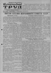 Пролетарий всех стран, соединяйтесь 1CovU£4cmu&H$U4 Т Р У Д Орган Карасукского райкома Коммунистической партии Советского Союза и районного Совета депутатов трудящихся, Новосибирской области. N-.6S (1698)\ 9 Л/ г¥ скТр/ с,Е»3ь%ДА | Ц е тЮ н о п . Новый Государственный бюджет отражает интересы советского народа и имеет целью обеспечить дальнейшее укрепление могущества и силы социалистического государства, рост экономики, культуры и науки, неуклонный подъём материального и культурного уровня трудящихся. ПЯТАЯ СЕССИЯ ВЕРХОВНОГО СОВЕТА СССР Открытие сессии В Совете Национальностей 5 августа, в Москве, в Большом Кремлёвском Дворце открылась пятая сессия Верховного Совета СССР. Она проходит в обстановке новых трудовых побед, одержанных советским народом в коммунистическом строительстве, в обстановке дальнейшего сплов В два часа дня в Большом Кремлевском Дворце состоялось заседание Совета Союза. В правительственных ложах — члены Президиума Верховного Совета СССР, министры. В зале— передовые люди промышленности п транспорта, видные учёные, деятели литературы и искусства. Заполнены ложи дипломатического корпуса. В ложах п р е с сы - представители советской и иностранной печати. За столом Председателя — Председатель Совета Союза депутат М. А. Яснов, заместители Председателя — депутаты А. И. Кириченко, Т. М. Зуева, A. К). Снечкус, А Н. Ниязов. Продолжительными, аплодисментами депутаты н гости встречают появление руководителей партии н правительства товарищей Г. М. Маленкова, B. М. Молотова, Н. С. Хрущева, К. К. Ворошилова, Л. М. Кагановича, М. 3. Сабурова, М. Г. Первухина. Депутат М. А. Ясной объявляет заседание Совета Союза открытым. Депутаты заслушивают доклад председателя Мандатной комиссии депутата А. М. Пузанова о результатах проверки полномочий депутатов, избранных в Совет Союза после третьей сессии вместо выбывших депутатов по шестнадцати избирательным округам. Докладчик сообщает, что во всех шестнадцати округах выборы произведены в полном соответствпп с Конституцией СССР п Положением о выборах. Выборы проходили в обстановке большого патриотического подъёма и политической активности населения. Избиратели единодушно голосовали за кандидатов блока коммунистов и беспартийных. Депутатами избраны: по Волховскому избирательному округу № 53 Ленинградской области— П. Ф. Ладанов, по Ржевскому избирательному округу № 170 Калининской области— В.II. Киселев, по Макеевскому избирательному округу № 487 Сталинской области — II. II. Хотенков, по Дербентскому избирательному округу №' 359 Дагестанской АССР— Т. Алпчения всех трудящихся вокруг Центрального Комитета Коммунистической партии Советского Союза и Советского правительства. Всё больше укрепляются нерушимая дружба народов нашей страны, морально-политическое единство советского общества. Iмов, по Кемеровскому избирательному округу № 174 Кемеровской области — В. М. Мокрушин, по Бродовскому избирательному округу № 4G0 Львовской области — II. С. Козланюк, по Казатпнскому избирательному округу № 391 Винницкой области— II.И. Ива- шутнн, по Арзамасскому избирательному округу № 145 Горьковской области— А. М. Саланов, по Ленннаканскому избирательному округу № 658 Армянской ССР— А. Е. Кочи- нян, по Таганрогскому избирательному округу № 262 Ростовской области— П. II. Гар- цуев, по БорЗинскому избирательному округу № 333 