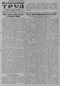 2. „Коллективный труд" а в 1 у ч а Пятая сессия Верховного Совета СССР Совместное заседание Совета Союза и Совета Национальностей (ОКОНЧАНИЕ. Н ачало н а 1-й стр.) Г. Н. Сафонова от обязапно стей Генерального Прокурора всех советских людей, во имя осуществления великой цели построения коммунистического общества в нашей стране (бурные, долго не смолкающие аплодисменты). Председательствующий говорит, что поступило предложение <тб окончании прений по докладу о Государственном бюджете СССР. Предложение принимается. Министр финансов СССР А. Г. Зверев в заключительном слове говорит, что замечания и предложения депутатов будут рассмотрены Советом Министров. Верховный Совет переходит к утверждению Государственного бюджета СССР на 1953 год, отчёта об исполнении Государственного бюджета за 1951 и 1952 годы и принятию Закона о Государственном бюджете СССР на 1953 год. Государственный бюджет СССР на 1953 год утверждается но доходам в сумме 544.2(54.72U.000 руб., по расходам— 530.532.048000 руб. с превышением доходов над расходами в 13.732.672.000 руб. Затем утверждается отчёт об исполнении Государственного бюджета СССР за 1951 и 1952 годы Верховный Совет единогласно принимает Закон о Государственном бюджете СССР на 1953 год и Закон о сельскохозяйственном налоге. Но второму вопросу повестки дня— утверждение Указов Президиума Верховного Совета СССР— слово предоставляется секретарю Президиума Верховного Совета СССР депутату В. М. Пегову. Верховный Совет утверждает Указы Президиума Верховного Совета СССР, принятые после IV сессии: о преступных антигосударственных действиях Берия;об образовании Министерства среднего машиностроения СССР; об освобождении Г. II. Косяченко от обязанностей председателя Госплана СССР; о назначении М. 3. Сабурова председателем Госплана СССР; об освобождении СССР; о назначении Генеральным прокурором СССР Р. А. Руденко; о назначении Министром Внутренних Дел СССР С. И. Круглова, министром среднего мащнностроения СССР В. А. Малышева, министром транспортного и тяжёлого машиностроения СССР II. И. Носенко, министром машиностроения СССР С. А. Акопова. Принимается постановление об избрании членами Верховного Суда СССР Н. 3. Данилова, II. II. Бардина, Ф. А. Беляева. Затем по предложению секретаря Президиума Верховного Совета СССР, депутата II. М. Пегова Верховный Совет постановляет внести изменения в текст 126 статьи Конституции СССР в связи с изменением наименования нашей партии, принятым на XIX съезде КПСС. Пятая сессия Верховного Совета СССР объявляется закрытой. (ТАСС.) с у д в о е н н о й э н е р г и е й С огромным удовлетворением встретили решения сессии члены артели „Новая семья". В ответ на заботу партии и правительства о колхозном крестьянстве они решили трудиться с удвоенной энергией. Ток третьей полеводче* ской бригады. Здесь днём и ночью слышен шум веялок, клейтонов. —У нас долго зерно не задерживается, — заявляет заведующий током т. Реуц- кий,—Особенно повысились темпы * работе после того, как колхозники узнали о Законах, принятых пятой сессией Верховного Совета СССР . Только за 12 августа с нашего тока было засыпано в закрома Родины 300 центнеров зерна. Хорошо потрудились в этот день М. Марковский, А. Шост, Е. Кубрак и многие другие. Они почти в два раза перекрыли нормы выработки. —Хорош новый Закон о сельхозналоге, — заявляет колхозница К. Дудкина.—В этом Зако