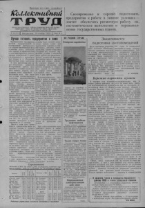 Пролетарии всех стран, соединяйтесь! 1СоиЛе1сгмг£ш1й Т Р У Д ОРГАН КАРАСУКСКОГО РАЙКОМА КОММУНИСТИЧЕСКОЙ ПАРТИИ СОВЕТСКОГО( ОЮЗА II РАЙОННОГО СОВЕТА ДЕПУТАТОВ _____________ ТРУДЯЩИХСЯ, НОВОСИБИРСКОЙ ОБЛАСТИ_______________ № 84 (1717)| Воскресенье, 18 октября 1953 г. | Цена 10 кСвоевременно и хорошо предприятия к работе в зимних- значит обеспечить ритмичную систематическое выполнение и нение государственных планов. подготовить условиях— работу их, перевыполните готовить предприятия к зиме Промышленные предприятия местной государственной и кооперативной промышленности играют ответственную роль в решении задач, поставленных партией и правительством в деле максимального удовлетворения потребностей и запросов трудящихся в разнообразных товарах и в обслуживании бытовых нужд населения. В свете выполнения этих задач обеспечение ритмичной, бесперебойной работы предприятий в условиях наступающего зимнего периода представляет собой важнейшее и неотложное дело. Оно включает в себя соответствующую подготовку производственных помещений, транспорта, накопление сырья, материалов, топлива, создание производственных условий для рабочих, а также удовлетворение нх бытовых нужд. Правильно поступило правление промартели «Энергия» (председатель т. Гресь) своевременно обсудив этот вопрос на заседании н наметив конкретный план мероприятий по подготовке предприятия к работе в зимних условиях. I? плане предусмотрено сооружение тамбуров в цехах, устройство электрической вентиляции, застекление вторых рам, завершение ремонта складских помещений, обеспечение топливом. Все эти работы сейчас активно проводятся и будут закончены до 25 октября. Вместе с этим здесь принимаются практические меры по подвозке топлива н удовлетворению других бытовых нужд рабочих артели. Одновременно проводится работа но подготовке к производственному сезону будущего года по выработке строительного кирпича: закрываются подзоры кирпичных сараев, складывается на зимнее хравенпе оборудование кирпичного завода, сооружается постамент для установки нового, более мощного кнрпнчеделательного пресса. Значительная подготовка к зиме проводится в райпром- комбинате (директор т. Слободецкпй). Здесь созданы достаточные запасы глины для производства черепицы в зимний период, утеплено глино- хранилпще. Хорошо оборудован столярный цех, созданы нормальные условия и обеспечен фронт работы для увеличивающегося количества мастеров. При конторе имеется красный уголок для отдыха рабочих. Но следует указать и на имеющиеся недоделки: для рабочих пилорамы не оборудована защита от сквозняков, не закрыт доступ снега к кольцевой печи кирпичного цеха и ряд других. Неудовлетворительно готовится к работе в зимних условиях промартель «Заготовитель» (председатель т. Пплп- пенко). Правление артели не разработало плана подготовки, не мобилизовало внимания членов артели, их творческую мысль и опыт для разрешения этих вопросов. Артель до сих пор не создала запаса топлива и живет ежедневной покупкой дров на лесоторговом складе. И промфинплане артели большой удельный вес занимает организация лова, переработки и реализации рыбной продукции. Скоро должен начаться подлёдный лов рыбы, но к этому артель не готовится. Здесь даже не продуманы вопросы материально-технического и организационного порядка по п