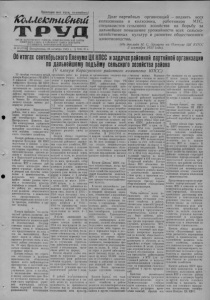 Пролетарпп всех стран, соединяйтесь! КЬиле1сти£*тй гш\ ОРГАН КАРАСУКСКОГО РАЙКОМА КОММУНИСТИЧЕСКОЙ ПАРТИИ СОВЕТСКОГО СОЮЗА И РАЙОННОГО СОВЕТА ДЕПУТАТОВ т р у д я щ и х с я, н о во с и ви р с к о й о бла с ти № &6 (1719) j Воскресенье, 25 октября 1953 г. | Цена Юк. Долг партийных организаций —поднять всех колхозников и колхозниц, работников МТС, специалистов сельского хозяйства на борьбу за дальнейшее повышение урожайности всех сельскохозяйственных культур и развитие общественного животноводства. (Из доклада Н. С. Хрущева на Пленуме ЦК КПСС 3 сентября 1953 года). ОбитогахсетнябрьсокогПленумаЦККПС изадачхарайонойпартийнойорганизаци подальнейшему подъёму селоьсгокхозяйстварайона (V пленум Карасукского районного комитета КПСС) 23 октября состоялся пятый пленум Карасукского РК КПСС, С докладом «Об итогах сентябрьского Пленума ЦК КПСС и задачах районной партийной организации но дальнейшему подъёму сельского хозяйства района» выступил секретарь районного ’ комитета партии т. Чиниль. По обсужденному вопросу пленум принял развернутое решение. Трудящиеся Карасукского района, как и весь советский народ, встретили постановление сентябрьского Пленума Центрального Комитета партии единодушным одобрением и восприняли его как боевую программу дальнейшего мощного подъёма социалистического сельского хозяйства. Пленум райкома считает, что вскрытые Пленумом ЦК КПСС недостатки и ошибки в руководство сельским хозяйством со стороны партийных и сельскохозяйственных органов целиком II ПОЛНОСТЬЮ относятся и к Карасукской районной партийной организации. Многие колхозы, МТС и совхозы района плохо используют имеющиеся огромные возможности и резервы для подъёма земледелия и животноводства, в результате чего получают крайне низкие урожаи зерновых и технических культур, картофеля и овощей. В целом по району не выполняется план развития общественного животноводства и повышения его продуктивности, неудовлетворительно НСИОЛ1 3Jют- ся тракторы, комбайны и другие машины. * Пленум признаёт, что достигнутый уровень развития животноводства и повышения его продуктивности является крайне недостаточным. Государственные планы по росту поголовья скота и повышению его продуктивности из года в год не выполняются. Поголовье коров в общем стаде крупного рогатого скота в колхозах района составляет только 32 проц. Продолжают оставаться низкими надои молока и настриг шерстя. Пленум считает, что серьёзное отставание в развитии животноводства объясняется прежде всего запущенностью производства и заготовок кормов. Не принимается мер к улучшению лугов и пастбищ, к возделыванию многолетних и посеву однолетних трав. Плохо поставлено производство на корм скоту картофеля, кормовых корнеплодов, арбузов, тыквы, кормовой капусты. Недооценивается механизация! трудоёмких работ на фермах и в первую очередь водоснабжения и кормоириготовленпя. Плохо ведется строительство животноводческих помещений. В результате недостаточного внимания к обеспечению кормами и пастбищами произошло сокращение скота в личных хозяйствах колхозников. Пленум поставил задачу— в 2-3 года ликвидировать отставание в развитии животноводства, создать прочную кормовую базу, обеспечить поголовье скотопомсщснпямн, до стпгнуть резкого увеличения производства продуктов животноводства. Довести удел
