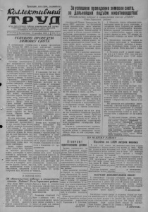 Пролетарии всех стран, соединяйтесь! КЬилективмил Т Р У Д ОРГАН КЛРЛСУКСКОГО РАЙКОМА КОММУНИСТИЧЕСКОЙ ПАРТИИ СОВЕТСКОГО СОЮЗА II РАЙОННОГО СОВЕТА ДЕПУТАТОВ ТРУДЯЩИХСЯ, НОВОСИБИРСКОЙ ОБЛАСТИ м 100(1733) | Воскресенье, 13 декабря 1953 г. J Цена 10 к. УСПЕШНО ПРОВЕДЕМ ЗИМОВКУ СКОТА В постановлении сентябрьского Пленума ЦК КПСС, наметившего пути крутого подъёма сельского хозяйства СССР, особое внимание уделено дальнейшему развитию социалистического животноводства, увеличению его продуктивности. Состояние животноводства, рост продуктивности стада в колхозах и совхозах во многом зависит от того, как организованно б) дет проведена зимовка скота. В нынешнем голу некоторые колхозы нашего района более заботливо подготовились к зимовке. В колхозе «Пятилетка» (председатель т. Русинов) выстроено 5 новых типовых помещений: конюшня, 2 коровника и 2 телятника. Все постройки хорошо утеплены, в них поделаны ясли, кормушки, настланы полы, на двух фермах смонтированы подвесные дороги. Тёпл)ю зимовку скоту подготовил колхоз вмени Тельмана (председатель т. Крупа). Здесь выстроен хороший кирпичный свинарник, типовой коровник, в котором оборудовано автопоение. Хорошие скотопоме- щення в колхозах им. Аман- гельды, «Красное знамя» и некоторых других. Но одна подготовка животноводческих помещений ещё не определяет благополучного исхода зимовки. Узким местом в районе является обеспечение скота кормами. У нас только совхозы заготовили потребное количество фуража. По колхозам же план накопления грубых кормов выполнен только на 61,9 проц., очень мало припасено силоса, не полностью застогована солома, мало завезено комбикормов. Значит, главное внимание сейчас должно быть обращено на экономное расходование кормов, организацию пх приготовления п заботливый уход за животными. Понимая это, многие колхозы с первых дней зпмовкп наладили строгий учёт н бережливое расходование фуража. Грубые корма скармливаются только в измельченном, запаренном и весу п нормам, предусмотренным помесячными планами расходования соответственно по определённым группам скота. Лучше, чем в других МТС, поставлена работа по кормо- прпготовлоншо в колхозах зоны Карасукской станции. Здесь в 5 колхозах работают кормозапарники, установлены силосорезки. По-хозяйски расходуются корма в колхозах «Пятилетка», им. Андреева и др. К сожалению, так дело обстоит далеко не везде. Колхозы им. Жданова, им. Аман- гельды, «Красный путиловец», имея низкую обеспеченность кормами, расходуют пх без веса и нормы, не сдабривают. В результате бесхозяйственности сельхозартели «Путь Ленина» и «Новый мир» в первый же месяц зимовки перерасходовали сотни центнеров сена. Имеющиеся кормозапарники и соломорезки в некоторых колхозах бездействуют. Особенно беззаботно относятся к кормоприготовленню Студёновская и Хорошпнская МТС. Директоры и зооветспе- цпалпсты этих станций не осуществляют контроль за сохранностью и бережным расходованием кормов, не руководят подвозкой и кормопрпго- товлением в колхозах. Велика роль сельских пар тпйных организаций. Они призваны взять в своп руки руководство зимовкой скота, уделив особое внимание расходованию и приготовлению кормов. Коммунисты и комсо мольцы своим личным трудом н агитационно-массовой работой на фермах должны способствовать сохранению поголовья скота п повышению 