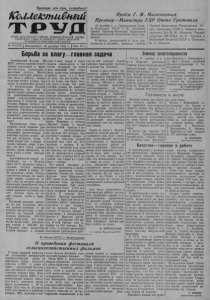 Пролетарии всех стран, соединяйтесь! КЬимшивншл Т Р У Д ОРГАН КАРАСУКСКОГО РАЙКОМА КОММУНИСТИЧЕСКОЙ ПАРТИИ СОВЕТСКОГО СОЮЗА II РАЙОННОГО СОВЕТА ДЕПУТАТОВ ______________ ТРУДЯЩИХСЯ, НОВОСИБИРСКОЙ ОБЛАСТИ_______________ № 102(1735) J Воскресенье, 20 декабря 1953 г. |Цена 10 к. Приём Г. М. Маленковым Премьер-Министра ГДР Отто Гротеволя 16 декабря с. г. Председатель Совета Министров СССР Г. М. Маленков принял Премьер-Министра Германской Демократической Республики Отто Гротеволя. В беседе, протекавшей в духе сердечности и дружбы, приняли участие Первый Заместитель Председателя Совета Министров СССР и Министр Ино- саранных Дел В. М. Молотов, Первый секретарь ЦК КПСС Н. С. Хрущев и Верховный Комиссар СССР в Германии В. С. Семенов. Борьбзаа влагу—главная задана Сентябрьский Пленум ЦК КПСС отметил наличие сущест пенных недостатков в производстве зерна, технических и масличных культур. Многие колхозы некоторых районов, в том числе и районов Сибири, получают низкие урожаи зерновых и технических культур. В постановлении Пленума указывается, что одной из причин низких урожаев являет ся пренебрежительное отно шение сельскохозяйственных работников к вопросам агротехники. Верным путем к повышению культуры земледелпя .является образцовое выполнение всех агротехнических мероприятий, среди которых особое значение имеет борьба за влагу. Кулундинская степь представляет собой открытые равнины, мало защищённые естественными препятствиями от действия сильных ветров. Летом они иссушают почву, а зимой уносят снег с пашни в околки, камыши, озёра. В местах, где мало снега, озимые посевы, травы вымерзают, запасы влаги в почве выветриваются. Агрономической наукой установлено, что в Кулунде около 60 70 процентов среднегодовых осадков выпадает осенью п зимой, и только 30- 40 процентов— летом. Отсюда становиться ясным, что накопление зимних осадков на полях— одно из могучих средств повышения урожайности сельскохозяйственных культур. Не даром народная пословица гласит: «Больше снега на полях— больше хлеба в закромах». Научными данными доказано, что для получения высоких урожаев пшеницы и др. культур этп растения в перерасчёте на каждый гектар должны поглотить 200-250 тысяч ведер воды. Это количество влаги дают естественные осадки в 200-300 мм. В Кулунде такое количество осадков выпадает в течение года в виде дождя и снега. Задача заключается в том. чтобы задержать на полях весь выпавший снег, сохра нить талые воды, своевременно прибить влагу и т. д. Отсюда ясно, что чем больше снега на полях, тем будет больше влаги в почве, тем выше ссберём урожай. Но важность снегозадержания не исчерпывается тол!ко пополнением запасов почвенной влаги, этим достигается также сохране ние её от выветривания и сохранение почвы от промерзания. В прошедшем году летних осадков выпало недостаточно. Однако там, где зимой было организовано снегозадержание, урожай был получен гораздо выше. Например, в колхозе «Красное знамя» в первой полеводческой бригаде в результате снегозадержания на площади 138 гектаров был достигнут снежный покров в 60 см. На этом поло урожай пшеницы был снят по 10,6 центнера с гектара. И наоборот, в четвёртом поле этой же бригады, где снегозадержание не проводилось и снежный покров едва достигал 20-25 см, урожай был собран по 7 центнеров с гектара. Этот пример наглядно доказывает выгодность и н