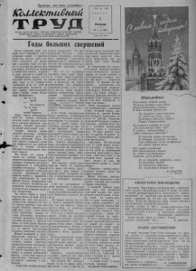 2. „КОЛЛЕКТИВНЫМ ТРУД “ 1 января 1954 года,_№_1__0738) % Впереди—коммунисты и комсомольцы Минувший 1953 год для коллектива работников Карасукского молочно-консервного завода был годом напряженного труда во славу любимой Родины, на благо советского народа. Воодушевленные решениями пятой сессии Верховного Совета СССР и другими постановлениями партии и правительства, направленными на удовлетворение постоянно растущих потребностей советских людей, работники завода добились значительных успехов в труде. Годовой план по выработке сухого молока был выполнен досрочно— 16 октября, до конца года коллектив дал Родине значителы- с количество этой продукции сверх плана. Эта победа была достигнута благодаря самоотверженной работе всех* рабочих нашего производства. Помимо количественных показателей мы добились значительного улучшения качества выпускаемой продукции, а также имеем экономию средств и материалов. В авангарде борьбы за досрочное выполнение производственного плана, за улучшение качества, снижение себестоимости продукции, 'экономию средств и материалов идут коммунисты и комсомольцы завода. Серьезные успехи в работе достигнуты отделом заготовок, возглавляемым-комну»п- стом П. Горб. Плац.заготовок молока и друон выполнил на 109 процен- — ^ тов. На 120-150 процентов выполняют задания бондари мастерской, где заведующим коммунист А. Шкуренко. Высокие производственные показатели имеет консервный цех, руководит которым комсомолка Е. Шевченко. Передовые работники этого цеха члены ВЛКСМ тт. Богунова, Брязгпн, Зинченко, Дубонос систематически перевыполняют дневные нормы, п своп годовые задания они завершили значительно раньше срока. Хорошо потрудились работники транспорта— шоферы Николай и Василий Зозуля, А. Левченко, Г. Молчанов. Каждый из них дал почти по полторы годовых нормы. Сейчас на заводе развертывается социалистическое соревнование за досрочное выполнение государственного плана 1954 года, за дальнейшее улучшение качества и снижение себестоимости продукции, за увеличение выпуска продукции без расширения производственных площадей и увеличения оборудования. А. ХИЛЬКО, секретарь парторганизации. В Харькове сооружается крупнейший на Украине мясокомбинат, который будет состоять из нескольких заводов. Только один завод первичной переработки скста будет выпускать в сутки более 100 тонн мяса, колбасный завод—25 тонн колбасы. На снимке: строительство Харьковского мясокомбината. Колхоз имени Андреева— миллионер Постановление сентябрьского Пленума ЦК КПСС наметило путь труженикам села к зажиточной жпзнп. После выхода в свет этого исторического документа в колхозе им. Андреева развернулась упорная борьба за максимальное использование имеющихся резервов в повышении доходов артельного хозяйства. Недавно мы подвели предварительные итоги работ за 1953 сельскохозяйственный год. Денежный доход колхоза составляет более 1.100.000 рублей. Почти полмнллпона рублей получено от реализации подсолнечника п рыжика. Значительная часть дохода поступила от проданной продукции животноводства. За счёт сданного государству молока по новым заготовительным повышенным ценам мы приобрели две грузовых автомашины. Богаче стали жить колхозники. На каждый трудодень выдано авансом по 1,5 килограмма хлеба и по одному рублю деньгами. При окончательном по