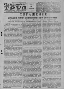 3. ' „КОЛЛЕКТИВНЫЙ ТРУД' 14 февраля 1954 года, № 15-16 (1753) ОБ Р АЩЕ НИЕ Центрального Комитета Комунистической парти СоветскогоСоюза Ко всем изоирателям, к рабочим и работницам, крестьянам и крестьянкам, к советской интеллигенции, к воинам Советской Армии и Военно-Морского Флота _______ (Окончание).__________________________ го народа и привести в чувство всякого, кто посмеет посягнуть на нашу свободу п независимость. Мы но боимся угроз со стороны любых агрессоров, но мы твердо и последовательно стоим за мир в интересах нашего народа н народов всего земного шара. Мы убеждены, что нет таких спорных вопросов современного международного положения, которые нельзя было бы разрешить мирным путем. Мирная внешняя политика Советского Союза подтверждена всеми его делами. Весь мир ныне видит колоссальную разницу между атмосферой неуверенности и военного психоза, искусственно создаваемой в капиталистических странах, и обстановкой мирного, творческого, созидательного труда, атмосферой спокойствия и уверенности, которая так характерна для страны социализма. Все видят, что главная забота и самое горячее желание советских людей— жить в миро и дружбе со всеми народами. Убедиться в этом может любой объективный, непредубежденный человек, достаточно ему посмотреть на наши города п села, на вдохновенный мирный труд советского народа. Глашатаем и знаменосцем мира называют нашу Родину миллионы людей во всех странах. Знамя мира и дружбы народов священно для нас, советских людей! Мы несем и будем впредь нести высоко это великое, благородное знамя. В тесном братском единении с миролюбивой советской державой борются за мир народно-демократические государства Европы и Азии. Могучей силой лагеря мира и демократии стала Китайская Нарбдная Республика. Вместе с Советским Союзом растет и крепнет весь демократический, миролюбивый лагерь, растет и ширится движение народов в защиту мира. Коммунистическая партия Советского Союза* п впредь будет отдавать все свои силы борьбе за мир, за дальнейшее укрепление могучего лагеря мира,-демократа п социализма, упрочение дружбы и сотрудничества советского народа с великим китайским народом, с трудящимися всех стран народной демократии, за всемерное развнтпе экономических связей и установление дружественных отношений Советского Союза со веема странами земного шара. Зорко стоя на страже интересов народа, его мирного труда, Коммунистическая партия но может не учитывать, что за рубежом есть реакционные пмперпалпстпческпе силы, которые стремятся обострить и усилить международное напряжение, развязать новую войну. Поэтому, проводя твердо и последовательно политику мира, всеми силами отстаивая п защищая великое и священное для всех народов дело мира, партпя считает необходимым неустанно совершенствовать и укреплять^ Вооруженные Солы Советского государства, чтобы обеспечить безопасность нашей Родины. Советский социалистический строй, навсегда уничтожив эксплуатацию человека человеком, поставил у власти лучших людей пз рабочего класса, колхозного крестьянства п трудовой интеллигенции, создал несокрушимое морально-политическое единство всего советского общества. Этот строй является самым демократическим в мире общественным п государственным строем. В управлении Советским государством принимают участие самые широкие нар