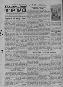 Пролетарии всех стран, соединяйтесь! КЬМШсшиСншй ОРГАН КАРАСУКСКОГО РАЙКОМА КОММУНИСТИЧЕСКОЙ ПАРТИИ СОВЕТСКОГО СОЮЗА И РАЙОННОГО СОВЕТА ДЕПУТАТОВ ТРУДЯЩИХСЯ, НОВОСИБИРСКОЙ ОБЛАСТИ 30 (1767) Воскресенье, 11 апреля 1954 г. Цена 10 коп. Сохранить всю влагвупочве Вступила в свои права первая весна претворения в жизнь исторических решений партии и правительства но подъёму социалистического сельского хозяйства. Труженики колхозов, МТС и совхозов района полны решимости с честью выполнить поставленную перед ними задачу— за счёт освоения целинных и залежных земель, а также за счёт повышения урожайности полей в ближайшие годы значительно увеличить производство зерна в стране. Чтобы уже нынче добиться значительных успехов в подъёме зернового хозяйства, необходимо осуществить целый комплекс агротехнических мероприятий. Важнейшим из них в условиях засушливых районов Кулунды является накопление и сохранение влаги в почве. Понимая это, многие колхозы провели, большую работу по накоплению на полях зимних осадков. Колхоз имени Молотова, например, план снегозадержания выполнил на 153 процента. Ценную помощь колхозам в этом деле оказали механпзаторы Карасукской МТС. Они тракторными снегопахами задержали снег на 8.750 гектарах. В ближайшие дни дружно начнет таять снег на полях. Быстро образовавшуюся при этом воду почва но сможет быстро впитать. И большое количество “ее может уйти в овраги и болота, размывая верхний слой почвы п унося с собой питательные вещества. В течение одного только дня мы можем потерять такое количество воды, которое равно осадкам от сильного дождя. Поэтому очень важно не допустить подобного явления. Задержание талых вод и закрытие влаги— это один из важнейших агрономических проемов, способствующих повышению урожайности. Для предупреждения стока вод с полей надо делать валки и борозды ---------------------------------------♦ - Предмайское поперёк склонов; в таком же направлении снег рекомендуется посыпать узкими полосами для ускорения его таяния. Прибивку влаги следует производить немедленно путем боронования освободившейся из под снега почвы. В наших условиях момент зрелости почвы определяется не днями, а часами. Иногда с утра земля может быть очень влажной, а к обеду уже пригодной для боронования. Очень важно поэтому установить тщательное наблюдение за выходом почвы из под снега и производить закрытие влаги выборочным путем. В колхозах зоны Карасукской МТС намечено закрыть влагу более чем на 12.000 гектарах. На эту работу будут поставлены 31 трактор, что позволит сохранить зимние осадки на запланированной площади в два дня. Болыпой объём работ по сохранению влаги будет произведен механизаторами Черно- Курьинской МТС. К проведению этого мероприятия здесь тщательно подготовились. Все тракторные бригады в полном составе уже прибыли в колхозы. Следует однако отметить, что некоторые колхозы в надежде на МТС никакой заботы не проявляют о подготовке сельхоз- ннвентаря к полевым работам. В сельхозартели «Новый мир», например, до сих пор лежат неисправными все бороны, почтп половина их не отремонтирована в колхозе нм. Дзержинского. Такое положение в ближайшие 1-2 дня должно быть исправлено. Весна 1954 года должна стать весной высокой агротехники. Руководители колхозов, МТС п совхозов, а также специалисты сельского хозяйства первым делом о