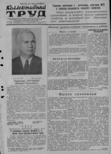 Пролетарии всех стран, соединяйтесь! ОРГАН КАРАСУКСКОГО РАЙКОМА КОММУНИСТИЧЕСКОЙ ПАРТИИ СОВЕТСКОГО СОЮЗА И РАЙОННОГО СОВЕТА ДЕПУТАТОВ ТРУДЯЩИХСЯ, НОВОСИБИРСКОЙ ОБЛАСТИ — ♦ ♦ Товарищу ХРУЩЕВУ Никите Сергеевичу Центральный Комитет Коммунистической партии Советского Союза и Совет Министров Союза ССР горячо приветствуют Вас, верного ученика Ленина и соратника Сталина, выдающегося деятеля Коммунистической партии и Советского государства, славного сына рабочего класса—в день Вашего шестидесятилетия. Коммунистическая партия и советский народ высоко ценят Ваши заслуги в борьбе за дело коммунизма, которому Вы посвятили всю свою жизнь. В суровое время гражданской войны, в условиях мирного социалистического строительства, в тяжелую годину Великой Отечественной войны и ныне, в мирный период борьбы за построение коммунистического общества в нашей стране—на всех постах партийной и государственной деятельности, Вы с присущей Вам неутомимой энергией, стойкостью и принципиальностью отдаете все силы завоеванию великих побед советского народа, подъему его благосостояния, созиданию коммунизма. От всего сердца желаем Вам, наш друг и товарищ, наш дорогой Никита Сергеевич, доброго здоровья и долгих лет дальнейшей плодотворной деятельности на благо советского народа и нашей Родины, на благо коммунизма. ЦЕНТРАЛЬНЫЙ КОМИТЕТ СОВЕТ МИНИСТРОВ КОММУНИСТИЧЕСКОЙ ПАРТИИ СОЮЗА ССР СОВЕТСКОГО СОЮЗА __________________________ У К А З ПРЕЗИДИУМА ВЕРХОВНОГО СОВЕТА СССР О присвоении товарищу ХРУЩЕВУ Н. С. звания Героя Социалистического Труда В связп с шестидесятилетием со дня рождения первого секретаря Центрального Комитета Коммунистической партвп Советского Союза товарища Хрущева Н. С. и отмечая его выдающиеся заслуги перед Коммунистической партией и советском народом, присвоить товарищу Хрущеву Никите Сергеевичу звание Героя Социалистического Труда С вручением ему ордена Ленина и золотой медали „Серп и Молот*. Председатель Президиума Верховного Совета СССР К. ВОРОШИЛОВ. Секретарь Президиума Верховного Совета СССР Н. ПЕГОВ. Москва, Кремль. 16 апреля 1934 года. Товарищи колхозники и колхозницы, работники МТС и совхозов, специалисты сельского хозяйства. Шире развертывайте социалистическое соревнование за мощный подъем зернового хозяйства, за дальнейший рост общественного животноводства! Высокий урожай—главный показатель в работе _______ Вести с полей — Как только механи з аторы тракторной бригады) : т. Говорун прибыли из К а р а с у к с к о н МТС в колхозу } 9Красное зн амяи, с р а з у же п ри ст упили к вывозке. i на поля навоза , подвозке кормов к фермам и пакоп- 1лению влаги на нолях . Они доставили к ме стом зн- ) [ моек и скота 800 центнеров сена и соломы. Трак то-) р н ст к а комсомолка А. Афанасьева за первый д( ш>) 1>аботы задержала талые воды на 58 г е кт а р а х зяон: вместо 40 гектаров по норме. Кач е ство р а б оты on - / реде . ,ено хорош, ,м. „ Гуевски#. \ ** * ) ^ Полным ходом ведут полевые работы члены uiec~\ тон бригады колхоза ,Маяк И л ь и ч а\ Под руковод- / ( сшвом бригадира И. Г у к они при помощи посыпания) ( снега золой и поделки валков задержали т а лы е воды) ( н а 70 г ектарах . ) А. Барило, j ШЕФСКАЯ ПОМОЩЬ Коллектив пункта „Заготзерно” уже не первый год шефствует над колхозом „Ноная семья”. Но в связи с возросшими задачами и объемом работ, которые предстоит выполнить труженика