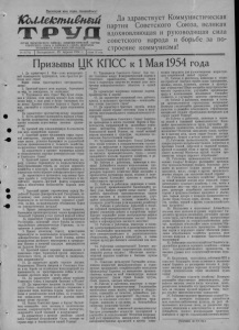 2. .КОЛЛЕКТИВНЫЙ ТРУД" 25 апреля, 1954 года № 34 (1771) Призывы ЦК КПСС к 1 Мая 1954 года 39. Работники совхозов! Настойчиво добивайтесь снижения себестоимости продукции, рентабельной работы каждого совхоза, улучшайте организацию производства и использование техники, неустанно повышайте урожайность полей и продуктивность животноводства! Превратим все совхозы в образцовые высокотоварные хозяйства! 40. Колхозники и колхозницы, работники МТС и совхозов! Обеспечивайте быстрый рост производства технических культур, овощей и картофеля! Добивайтесь значительного повышения урожайности этих культур, широко внедряйте в производство механизацию и передовую агротехнику! 41. Работники местной промышленности и промысловой кооперации! Увеличивайте производство н повышайте качество товаров широкого потребления! Всемерно расширяйте сеть предприятий бытового обслуживания населения, улучшайте их работу! 42. Работники государственной и коопе^ ративной торговли! Всемерно развертывайте советскую торговлю в городе и деревне, расширяйте сеть магазинов и предприятий общественного питания! Изучайте спрос населения, добивайтесь полного удовлетворения потребностей трудящихся в необходимых товарах! Боритесь за повышение культуры советской торговли! 43. Работники железнодорожного транспорта! Боритесь за увеличение перевозок грузов для народного хозяйства, за повышение скорости движения поездов, за сокращение простоев вагонов! Улучшайте использование подвижного состава и снижайте себестоимость перевозок! Лучше обслуживайте пассажиров! Обеспечивайте четкую, бесперебойную работу железных дорог! 44. Работники морского и речного флота! Увеличивайте объем перевозок, ускоряйте оборот судов, улучшайте работу портов, пристаней и судоремонтных заводов! Неуклонно снижайте себестоимость перевозок! Образцово проведем навигацию 1954 года! 45. Работники автомобильного транспорта п шоссейных дорог! Увеличивайте перевозки автотранспортом грузов для народного хозяйства и товаров для населения, улучшайте перевозку пасса жиров! Лучше используйте автомобильный транспорт, содержите шоссейные дороги в образцовом порядке! 46. Работники связи! Развивайте и совершенствуйте средства связи! Повышайте качество работы почты, телеграфа, телефона, радио! Улучшайте обслуживание населения! 47. Работники советских учреждении! Неустанно совершенствуйте работу государственного аппарата, решительно искореняйте бюрократизм и волокиту! Укрепляйте государственную дисциплину, строго соблюдайте социалистическую законность! Чутко относитесь к запросам и нуждам трудящихся! 48. Работники науки и техники! Двигайте вперед советскую науку и технику! Смелее развертывайте критику недостатков в научной работе! Повышайте роль советской науки в развитии всех отраслей народного хозяйства, в обеспечении дальнейшего про- гросса нашей Родины! Улучшайте подготовку специалистов! 49. Работники литературы и искусства! Боритесь за дальнейшее развитие советской литературы п искусства! Повышайте идейный и художественный уровень своего творчества! Создавайте произведения, достойные нашего великого народа! 50. Работники народного просвещения! Повышайте качество обучения п воспитания в школе! Воспитывайте детей в духе любви и преданности Советской Родине, дружбы между народами! Готовьте культу