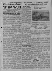 ■V ) ----- ^ ' ....., |. K o U d e ic fM iC M iA Включать в косовицу трав все сеноуборочные средства Т Р У Д ОРГАН КАРАСУКСКОГО РАЙКОМА КОММУНИСТИЧЕСКОЙ ПАРТИИ СОВЕТСКОГО СОЮЗА И РАЙОННОГО СОВЕТА ДЕПУТАТОВ ТРУДЯЩИХСЯ, НОВОСИБИРСКОЙ ОБЛАСТИ № 59 (1796) Пятница, 25 июня 1954 г. Цена 15 коп. Массово-политическая работа- основа хозяйственных успехов В сельском хозяйство района начинается одна из ответственных кампаний—сенокос. От проведенпя её в основном будет зависеть дальнейшее увеличение поголовья общественного скота и повышение его продуктивности. У нас есть все возможности успешно справиться с поставленной задачей— вдосталь заготовить качественных и разнообразных кормов для общественного животноводства. Партия учит, что хозяйственные успехи, их прочность и длительность целиком н полностью зависят от успехов партийно - организационной и партийно-политической -работы. Это неопровержимо доказывается примерами из нашего района. Там, где партийные организации умело сочетают политическую работу с хозяйственной, результаты производственной деятельности несравненно выше, чем там, где политическая работа недооценивается, ироводится в отрыве от хозяйственных задач. Октябрьская машинно-тракторная стаицпя лучше других справилась с весенними полевыми работами. Организованно провели сев и заготовку земли под урожай будущего года механизаторы, работающие на полях колхоза имени Молотова. Партийная организация колхоза, правильно поняв значение массово-разъяснительной работы, деятельности агитколлектива уделяет повседневное внимание. Здесь агитаторы регулярно встречаются с хлеборобами, своп беседы увязывают с конкретными задачами, стоящими перед бригадами, колхозом. Рассказывая о решениях сентябрьского и февральско-мартовского Пленумов ЦК КПСС, агроном колхоза коммунист т. Бурдиков вскрывает недостатки в работе, совместно с механизаторами и колхозниками намечает конкретные пути по улучшению обработки земли, повышению производительности труда. Заслуживает похвалы работа агитатора комсомольца т. Коп- телова. В своих регулярно проводимых беседах он рассказывает членам бригады т. Пп- нпгина об опыте работы лучших трактористов, прицепщиков. Являясь трактористом, он сам показывает личный пример максимального использования техники. Хорошо поставленная разъяснительная работа сказывается на результатах работы — бригада т. Пинигина по выработке на трактор занимает одио пз первых мост в районе. Факты однако показывают, что не все парторганизации по- настоящему руководят политической работой. Это является одной пз причин отставания некоторых бригад и колхозов. Например, парторганизация сельхозартели имени Сталина (секретарь т. Шаманский) с начала весны утвердила состав агитаторов и на этом усново-, илась. В результате агитколлектив здесь бездействует. Колхоз плохо справляется с развитием общественного животноводства, растянуты были сроки весеннего сева. Парторганизация через агитаторов не мобилизует колхозников на более полное использование имеющихся резервов и возможностей, на ликвидацию отставания. Хуже того, т. Шаманский вместо укрепления общественного хозяйства сам стал на путь нарушения Устава сельхозартели. У нас есть и такие сельхозартели, которые, наиравляя работу агитаторов, учитывают лишь число проводимых ими бесед. Агитат