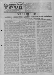 5. КОЛЛЕКТИВНЫЙ ТРУД 16 июля 1954 года, № 68 ОБРАЩЕНИЕ УЧАСТНИКОВ СОВЕЩАНИЯ ПЕРЕДОВИКОВ СЕЛЬСКОГО ХОЗЯЙСТВА СИБИРИ НО ВСЕМ НОЛХОЗНИНАМ И КОЛХОЗНИЦАМ, РАБОТНИНАМ МТС, СОВХОЗОВ, ЗАГОТОВИТЕЛЬНЫХ ОРГАНОВ И СПЕЦИАЛИСТАМ СЕЛЬСНОГО ХОЗЯЙСТВА СИБИРИ Татарской МТС, Новосибирской области, Захара Ходорснко из Чилийской МТС, Томской области, достигших в 1953 году высокой дневной выработки. Необходимо широко применять их методы работы. Товарищи комбайнеры! Включайтесь в социалистическое соревнование, начавшееся в стране по призыву ставропольцев, за выполнение и перевыполнение дневных норм и высокий намолот зерна. Пусть каждый комбайнер возьмет на себя конкретные обязательства и с честью осуществит их. Мы призываем вас, товарищи комбайнеры, чтобы каждый из вас добился ежедневной выработки на комбайне «Сталинец» не менее 14— 16 гектаров, на самоходном комбайне и комбайне «ломмунар» 12— 14 гектаров. Наряду с нолным использованием комбайнов будем широко применять простые уборочные машины. Одной из самых важных задач на уборке является борьба с потерями зерна. Не секрет, что в прошлые годы в областях Сибири при уборке терялось много хлеба. Наша задача— с первых дней уборки урожая закрыть все каналы потери зерна. Для этого необходимо оборудовать все комбайны зерноуловителями, сделать приспособления к комбайнам для уборки высокорослых и полеглых хлебов, правильно отрегулировать машины. Для обмолота хлебов и подработки зерна при любой погоде следует построить и отремонтировать достаточное количество сушилок, навесов и механизированных крытых токов. В текущем году нам предстоит перевезти большое количество зерна в государственные и колхозные амбары. В связи с этим мы обязаны своевременно подготовить автомобильный и гужевой транспорт колхозов и совхозов, заранее выделить опытных возчиков. На перевозках хлеба решающая роль принадлежит шоферам. Товарищи шоферы, включайтесь в социалистическое соревнование за образцовую перевозку зерна без потерь. Интересы дальнейшего укрепления могущества нашей Родины и неуклонного подъема благосостояния народа требуют, чтобы колхозы и совхозы успешно выполнили государственные задания по заготовкам и закупкам сельскохозяйственных продуктов. Мы призываем колхозников и колхозниц, работников МТС и совхозов, специалистов сельского хозяйства приложить все силы к досрочному выполнению планов заготовок и закупок хлеба и других продуктов, а также обеспечить засыпку колхозами и совхозами доброкачественных семян, создание фуражных и страховых фондов. На заготовительные пункты пойдет много сибирского хлеба. Наша обязанность хорошо организовать его приемку и сохранность. Мы обращаемся с призывом ко всем работникам заготовительных органов, элеваторов и пунктов обеспечить своевременную подготовку складского хозяйства, бесперебойную приемку хлеба, работу сушилок и зерноочистительных машин, максимально механизировать погрузочно-разгрузочные работы, подготовить дороги, подъездные пути к элеваторам и пунктам приемки хлеба, не допускать потерь при приемке и хранении зерна. Дорогие товарищи! Колхозы и совхозы Сибири занимают важное место по производству продуктов животноводства в стране. Мы имеем большие возможности презервы дальнейшего увеличения поголовья скота и повышения его продуктивности. У на