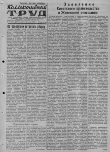 КОЛЛЕКТИВНЫЙ ТРУД 25 июля 1954 года, № 72 Убер и без потерь Работать групповым методом (Иа выступления механика Октябрьской МТС т. А ст а хова) Наши колхозы имеют обширные посевные площади. Во время уборки в некоторых полеводческих бригадах работает по 5-7 п даже до десяти комбайнов. Если такое количество техники рассредоточено по отдельным полям, создаются большие трудности у членов бригады, чтобы обеспечить бесперебойную отгрузку зерна, своевременно подвезтп горючее, воду и т. д. По примеру передовых машинно-тракторных станций, мы нынче решили внедрить групповой метод работы комбайнов. Сосредоточение нескольких агрегатов на сравнительно небольшом участке позволяет наиболее производительно использовать транспорт на отвозке зерна, обеспечивать машины горючим п водой, оказывать пм техническую помощь. В прошлом году этот метод применялся у нас в колхозе «Пятилетка». Он полностью себя оправдал, и нынче мы его внедрим во всех колхозах. Намолочу 12.000 центнеров зерна (Из выступления комбайне р а Хорогиинской МТС т, Н е стерова) 2.4 июля в К ар а с у ке состоялось районное совещание комбайнеров С УЧ(*~ стаем директоров МТС и совхозов, секретарей партийных ор ганизации и мехи ников по комбайнам. Доклад «О выполнении постановления июньского Пл ен ума ЦК КПСС и з а дач а х комбайнеров на уборке у рожая« сделал председатель райисполкома В прениях выступило 17 человек. Ниже мы печатаем социалистические обязательства комбайнеров, принятые па совещании, и отдельные выступления комбайнеров. Социалистические обязательства участников районного совещания комбайнеров Рослые, богатые хлеба нынче зреют на полях. Чтобы пх во-время и без потерь убрать, потребуется немало усилий в работе. Поддерживая почин инициаторов областного соревнования комбайнеров, я беру обязательство убрать на самоходном комбайне за 25 рабочих дней 800 гектаров п намолотить 12 тыс. центнеров зерна. Жатву буду вести в колхозе имени Калинина. Но плохо то, что мой комбайн еще не вполне готов к работе: не обортован цепями, нет аккомулятора. Дирекция МТС мало проявляет беспокойства об этом. Пользуясь случаем, я хочу предъявить еще одну претензию к дирекции МТС. В прошлом сезоне меня по распоряжению руководства станции все время перебрасывали из одного колхоза в другой. На эти переезды уходило много драгоценного временп, которое я мог бы с успехом использовать на жатве хлебов. Хотелось бы, чтобы нынче это не повторилось. Когда будут готовы комбайны? (Пз выступления председателя колхо за имени Д з е р жинского т. Бунина ) . Уборка не за горами, но пз 9 комбайнов, которые должны убпрать у нас зерновые, еще пять не готовы к работе. Дирекция Студеновской МТС, прикрываясь различными причинами, на неопределенные сроки оттягивает пх подготовку. Богатый урожай вызревает нынче на колхозных и совхозных полях района. Перед комбайнерами стоит ответственная задача—убрать его во-время и без потерь. С чувством глубокого удовлетворения восприняли мы постановление июньского Пленума ЦК КПСС „Об итогах весеннего сева, уходе за посевами, о подготовке к уборке урожая и обеспечении выполнения плана заготовок сельскохозяйственных продуктов в 1954 году". Июньский Пленум наметил для тружеников сельского хозяйства развернутую программу подготовки и проведения уборки урожая, подчеркнул, что от своевременного 