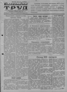 4 августа 1954 года, № 76 КОЛЛЕКТИВНЫЙ ТРУД 3. Быстрее устранить недостатки. Итоги соревнования на 1 августа Постановление июньского Пленума Центрального Комитета нашей партии, направленное на дальнейший подъем сельского хозяйства, является четкой программой действий тружеников социалистического земледелия. Выполняя указания партии, члены сельхозартели «Вперед к коммунизму» наряду с заготовкой кормов для общественного животноводства не забывали о о предстоящей, одной из важнейших сельскохозяйственных кампаний— уборке нового урожая. В частности, две старые молотилки переоборудованы в веялки, которые будут работать при помощи конного привода и механического двигателя. На них можно будет очищать за сутки до 1000 центнеров зерна. Кроме того, колхоз подготовил к работе пять старых сортировок, приобрел две новых. Заслуживает похвалы труд плотников и кузнецов. Они, добросовестно выполняя заказы на ремонт сеноуборочных средств, во-время подготовили к работе более двадцати бричек для транспортировки зерна. Однако в сельхозартели имеются серьезные недостатки в деле подготовки к уборке нового урожая. Несмотря на то, что сегодня дожны приступить к косовице рыжика, здесь не чувствуется организованности в этом деле. Нз имеющихся трех токов еще ни один не подготовлен. Бригадир второй полеводческой бригады т. Черненко не выполнил указания правления о переноске тока на новое место. Особенно тревожное положение создалось с подготовкой складских помещений. Хотя их здесь недостаточно, мер к строительству новых не принимается. Председатель колхоза т. Коростылев заявляет, что дополнительные склады мы будем готовить из нолуразва- лившихся построек. Но в них вряд ли можно будет в зимнее время сохранять семенное и фуражное зерно от порчи. Не готовится к работе и зерносушилка. Она стоит ободранная, с просвечивающими стенами. В артели совершенно отсутствует такой мелкой уборочный инвентарь, как лопаты, метлы, недостаточно ведер. Немаловажную роль в успешном завершении уборки урожая и хлебосдачи будет играть своевременная очистка посевов от сорняков,особенно от полыни. Однако в колхозе этому вопросу мало уделяют внимания. Так,например, в третьей полеводческой бригаде (бригадир т. Азаров) около 300 гектаров пшеницы заросла полынью. Очисткой ее почти никто не занимается. Тт. Черненко п Азаров подготовкой к уборке урожая вплотную думаюТзаняться только после окончания сенокоса. Такая кампанейщина чревата последствиями. Правление колхоза составило план на период уборки урожая. Но что с того проку, если он до сего дня не обсужден на общем собрании. Никто из колхозников не знает, где он будет работать. Хороший урожай вырастили нынче члены колхоза «Вперед к коммунизму». В среднем с каждого гектара предпслагается получить но 80— 100 пудов зерна. Но, ка к говорят, не 1 тот урожай, что на полях, а тотг что в закромах. Вот почему все свои усилия колхозники сельхозартели совместно с механизаторами сейчас должны направить на быстрейшее окончание подготовительных работ к хлебоуборке. П. Алексеев. Рассмотрев итоги соревнования колхозов, МТС, совхозов и сельских Советов на заготовке кормов по состоянию на 1 августа, райисполком и бюро РК КПСС признали победителями: Сельхозартель «Путь к коммунизму», выполнившую план заготовки грубых кормов на 65 процентов. При