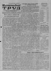 Пролетария всех стран, соединяйтесь! • •«•••••«•••••■ ■ •••a K bddeJC fhU & H G U d ОРГАН КАРАСУКСКОГО РАЙКОМА КОММУНИСТИЧЕСКОЙ ПАРТИИ СОВЕТСКОГО СОЮЗА И РАЙОННОГО СОВЕТА ДЕПУТАТОВ ТРУДЯЩИХСЯ, НОВОСИБИРСКОЙ ОБЛАСТИ № 95 (1832) Воскресенье, 19сентября 1954 г. Цена 15 коп. Все силы и средства на спасение урожая! Наступила самая напряженная пора для колхозных нсовхозных хлеборобов. Обильный урожай, выращенный общими усилиями колхозников и механизаторов, перестаивает, начинает осыпаться. Сейчас дорог буквально каждый час. Каждый день промедления с уборкой уносит тысячи центнеров зерна от осыпания, колхозы и колхозники по этой причине могут потерять миллионные доходы. Между тем, дело уборки зерновых в нагаем районе находится в крайне критическом состоянии. Еще на корню находится половина всех посевов основной продовольственной культуры—пшеницы. Прирост в уборке за третью пятидневку сентября не составил и 8 процентов. Мощный комбайновый парк вместо наращивания темпов резко снизил производительность. Безобразно использовались в эти дни комбайны в Карасукской и Хорошпнской МТС, где среднесуточная выработка на каждый комбайн составила немногим более 5 гектаров. В Хорошпнской МТС, например, машина комбайнера Зайцева простояла на приколе три смены, а Зайцев в это время вместе с бригадиром тракторной бригады Яковлевым, трактористом Миронсц пьянствовали. Икак ни странно, организатором этой иьянкп явился.., механик МТС Голубев. Снизила темны и значительно ниже своих возможностей вела уборку Студенов- ская МТС. Недопустимо плохо в минувшую пятидневку шла отгрузка хлеба государству. Прирост составил всего лишь 8,1 процента. А между тем на токах скопилось около 400 тысяч центнеров хлеба. Такое положение объясняется прежде всего безответственным отношением руководителей МТС и колхозов к очистке п сушке зерна. До епх пор не работают зерносушилки в колхозах имени Дзержинского, имени Молотова, «Маяк Ильича» и других. По этой причине хлеб не засыпается в открытые на местах глубинные пункты. В дальнейшем такое положение с уборкой нхлебосдачей нетерпимо. Задача состоит в том, чтобы до 25 сентября убрать все зерновые и выполнить годовой план заготовок и закупок зерна. К этому у нас есть все возможности. Каждый комбайн должен работать в сутки не менее 20—22 часов. В районе уже есть примеры самоотверженной работы комбайнеров. В колхозе имени Калинина комбайнер Иван Ульман 1G сентября за 21 час работы убрал 47 гектаров пшеницы. Отдохнув два часа, он снова стал за штурвал. Товарищи комбайнеры! Следуйго примеру Ивана Ульмана, не оставляйте штурвал, не выполнив двух сменных норм! Обязанность руководителей колхозов—обеспечить бесперебойную отгрузку зерна на ходу, для этой цели необходимо поставить весь транспорт. Дневной график уборки и хлебосдачи должен стать непреложным законом для каждого колхоза. С этой целью все поступающее от комбайнов зерно должно немедленно подрабатываться, а с повышенной влажностью— просушиваться. Работа на токах но должна прекращаться круглые сутки. Рабочие и служащие предприятий и учреждений, выходите на помощь колхозникам в ночные смены на очистку зерна! Партийные организации должны взять под неослабный контроль работу зерносушилок, добиться, чтобы зерносушильные агрегаты работали высокопроизводительно полные сутки. 