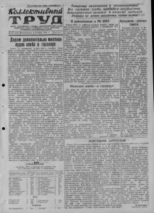 КОЛЛЕКТИВНЫЙ ТРУД 3 октября 1954 года, № 101 Парад и праздничная демонстрация в Пекине 1 октября в Пекине в честь всенародного праздника— пятилетия Китайской Народной Республики состоялись военный парад и демонстрация тр у дящихся. Демонстрация, в которой приняли участие свыше 500 тысяч человек, прошла под знаком единства китайского народа, преисполненного решисоцизлпзма в Китае, поз знаком сплоченности трудящихся масс вокруг коммунистической партии Китая и народного правительства. Празднпчвое шествие трудящихся Пекина явилось мощной демонстрацией непреклонной решимости китайского народа освободить псконнюю китайскую территорию -остров Тайвань и бороться за укрепление мира в Азин ТАСС. мости трудиться во имя новых побед, во имя строительства и во всем мире. Убирала в любую погоду Уборка урожая нынче была не из легких. Зерновые уда лись рослыми и высокоурожайными. Притом, в посевах попадала зелень, мешала и ненастная погода. Однако наш агрегат вел косовицу в любую погоду. Чтобы лучше вымолачивалось зерно из влажной соломы, мы переставили деки: заднюю перенесли в средину, а среднюю— на её место. Наши комбайны оборудованы хорошим освещевпем. Это создавало условия для круглосу точной работы. Косовицу, как правило, мы начинали рано утром и заканчивали поздней ночью. Обедали по очереди, не останавливая машин. Скосили 200 гектаров полеглого хлеба. Для этого переоборудовали режущий аппарат, поставив его на более быстрые обороты. Мотовило вынеелп вперёд, а на его лопасти нашили ремень, вырезанный из старого полотна. Уборку воли на небольшой скорости. Это облегчало работу режущего аппарата. Штурвальными со мной работают Геннадий Карнаухов о Владимир Алексеев. Свои обязанности они освоили хорошо, могут самостоятельно управля ть комбайнами. Это они хорошо доказали на деле в сентябре месяце, когда меня дирекция совхоза направляла в Москву на Всесоюзную сельскохозяйственную выставку. Буксирует агрегат трактор Василия Повелькпна. Он опытный механизатор и успевает не только готовить свою машину к работе, но и часто помогает нам. Бесперебойно отвозил зерно шофер Карасукской автороты Федор Скиба. На расстояние 5— 10 кипометров он делал часто до 20 и более рейсов и один успевал отгружать хлеб от обоих комбайнов. За 25 рабочих дней коллектив нашего агрегата убрал сцепом двух «Сталинцев» 825 гекта ров п намолотил около 13,5 тысячи центнеров зерна. Сейчас наш агрегат убирает ценную кормовую к у л ь т ур у— Могар. А. Орпщенко, комбайнер совхоза «Октябрь». Нерадивые хозяева Карасукскпй рынок п торговая сеть потребкооперации далеко но удовлетворяют спрос городского населения на продук ты садоводства и огородничества. Можно подумать, что в колхозах не производят или недостаточно выращивают плодовоовощных культур . Между тем это совсем но так. Кол хоз пм. Тельмана, напрпмер, в начале сентября снял 31 центнер яблок в своём плодовом ’саду. Урожай по весу был сдан садоводом т. Могилёвском на склад колхоза. Казалось бы, что, зная свойство этого продукта как скоропортящегося, правление колхоза должно было принять меры к своевременной реализации яблок. Однако этого не случилось. В течение трех недель велись разговоры о способе реализации столь ценного в условиях Сибири витаминного продукта. В результате решили распределить яблоки на трудодни. У с танови