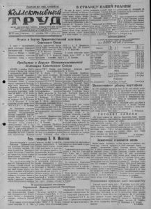 Пролетария всех стран, соединяйтесь! ОРГАН КАРАСУКСКОГО РАЙКОМА КОММУНИСТИЧЕСКОЕ ПАРТИИ СОВЕТСКОЮ СОЮЗА И Р^ОРРОГО СОВЕТА ДЕПУТАТОВ ТРУДЯЩИХСЯ, НОВОСИБИРСКОЙ ОБЛАСТИ В С Т О Л И Ц У Jfe 103 (1840^ | Пятница, 8 октября 1954 г. Цена 15 к. На днях из нашего района выехала в Москву на Всесоюзнуюсельскохозяйственную выставку новая группа экскурсантов в составе 10 человек. Среди впх председатели колхозов имени Куйбышева и ♦■Пятилетка» тт. Трунов п Русинов. Эти хозяйства добились нынче резкого увеличения валового сбора зерна, организованно провели уборку урожая п в числе первых но району завершили годовой план хлебозаготовок. Успешно выполнила хлебозаготовки артель «Путь Ленина». Председатель ее т. Кабпцкпй также в числе экскурсантов выехал в столицу- Заведующий конефермой колхоза имени Сталина Михаил Петрович Пешков получил нынче от 55 конематок 52 жеребенка п в:ех пх сохранил. За успехи в развитии колхозного Р О Д И Н Ы коневодства он направлен aft экскурсию на Всесоюзную сель- хозвыставку. Среди экскурсантов—старейший долевой бригадир колхоза имени Калинина Илья Емелья- новпч Черепенько,управляющий фермой №3 совхоза «Октябрь» т.Назаренко,бригадиры тракторных бригад из ОктябрьскойMlС т. Горбатенко, из Караоукской— т. Говорун и др, Отъезд в Берлин Правительственной делегации Советского Союза В связи с празднованием пятой годовщины Германской Демократической Республики отбыла из Москвы в Берлин Правительственна, делегация Советского Союза в составе первого заместителя Председателя Совета Министровп Министра иностранных дел СССР т. В. М. Молотова (руководитель делегации), секретаря ЦК КПСС т. П. Н. Поспелова, президента Академии наук СССР т. А. П, Несмеянова, секретаря ЦК КП Украины т. 0. П. Пвиценко. В состав делегации входиг также посол СССР в ГДР т. Г. М. Пушкин. Прибытие в Берлин Правительственной делегации Советского Союза БЕРЛИН, 5 октября. (ТАСС). Сегодня в Берлин для участия в праздновании пятой годовщины Германской Демократической Республики прибыла Правительственная делегация Советского Союза в составе первого заместителя Председателя Созета Министров СССР и Министра иностранных дел СССР тов. В. М. Молотова (руководитель делегации), секретаря ЦК КПС т. П. Н. Поспелова, президента Академии наук СССР т. А. П. Несмеянова, секретаря ЦК КП Украины т. 0. И. Иващенко. В состав делегации входит также посол СССР в ГДР т. Г. М. Пушкин. На берлинском аэродроме Шенефельд, торжественно украшенном государственными флагами Германской Демократической Республики, СССР и стран народной демократии, Правительственную де легацию Советского Союза встречали премьер-министр ГДР 0. Гротеволь, первый секретарь ЦК СЕГ1Г п заместитель премьер- министра ГДР В. Ульбрихт, член Политбюро ЦКСЕПГ и заместитель председателя Народной палаты ГДР Г. Матреы, замо- стпгели премьер-министра ГДР 0. Нушке, Г. Рау, Г. Лох, члены Политбюро ЦК СЕПГ, секретари ЦК СЕПГ К. Шярдеван, Ф. Эльснер, секретари ЦК СЕПГП. Вандель и Э. Мюккенбергер, председатель Государственной плановой комиссии Б. Лейшнер, председатель Центральяой комиссии государственного контроля Ф. Ланге, министры К. Вах, И. Бехер, К. Грег щ, Г. Лаабс, В. Фельдман, Р. Хвалек, Ф.Махер, Г. Винклер, X. Бенья- мин, В. Штоф, председатель Объединения свободь-ых немецких профсоюзов Г. Варнке, статс-секретарь МИДГДР Г. Ха- ндке, ответственные сотр